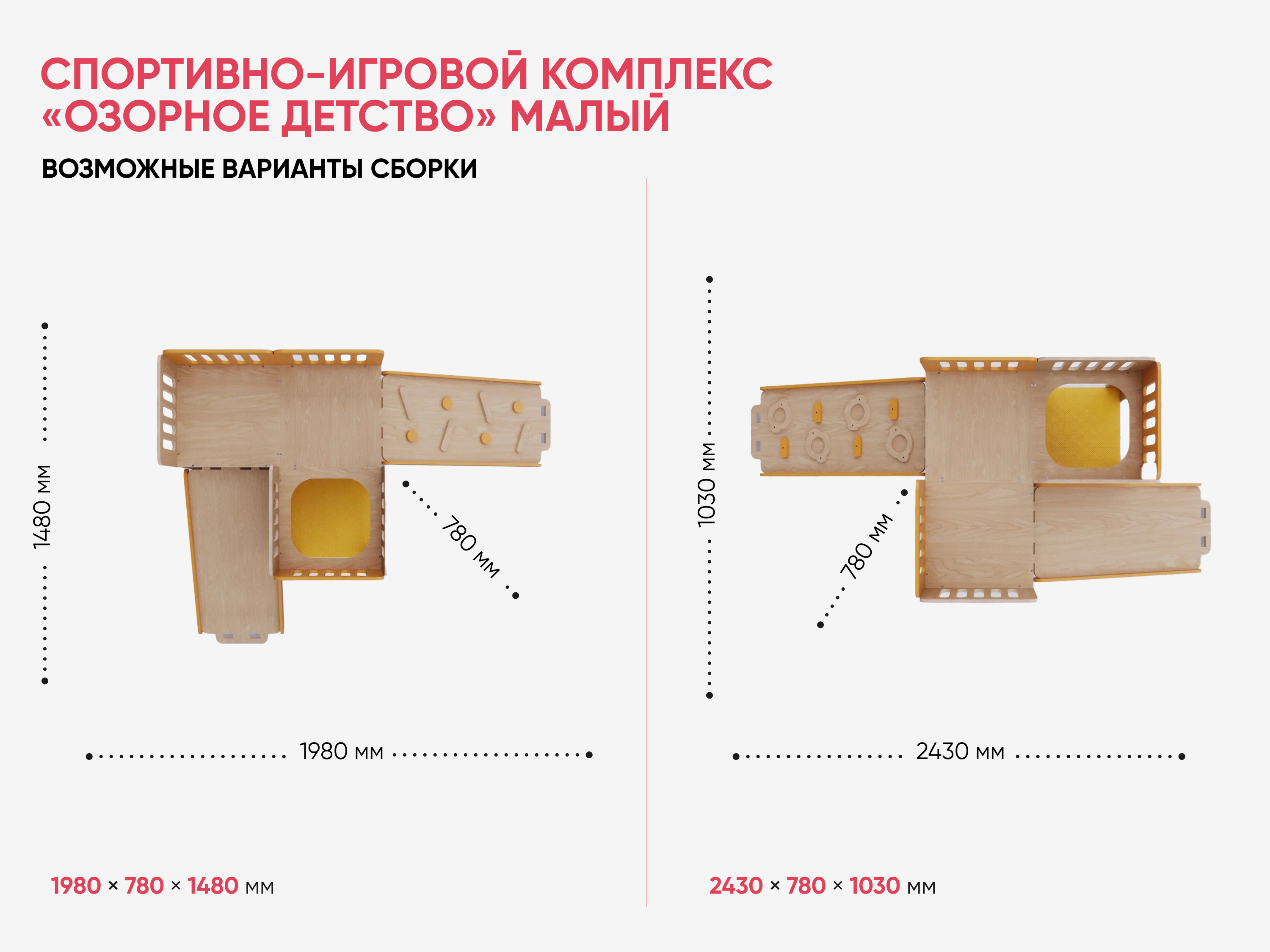 Габариты (ширина и глубина) игрового комплекса будут меняться в зависимости от ваших вариантов сборки. Высота комплекса всегда будет равна 780 мм.