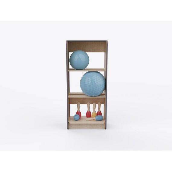 Стеллаж с полками для хранения мячей диаметром от 15 до 30 см. На одной полке высотой 36,5 см в среднем помещается 2 мяча. Задней стенки у стеллажа нет. Нижняя полка подходит для хранения разного спортивного инвентаря.
