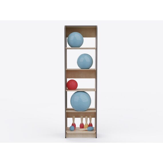 Стеллаж с полками для хранения мячей диаметром от 15 до 30 см. На одной полке высотой 36,5 см в среднем помещается 2 мяча. Задней стенки у стеллажа нет. Нижняя полка подходит для хранения разного спортивного инвентаря.