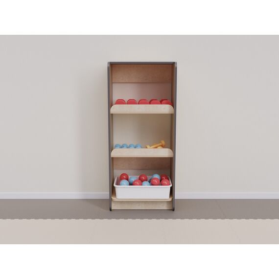 Стеллаж с полками, рабочая глубина которых составляет 30 см, а высота — 36,5 см, разработан для хранения разного спортивного инвентаря. Бортик в 6 см препятствует случайному падению предметов с полки.