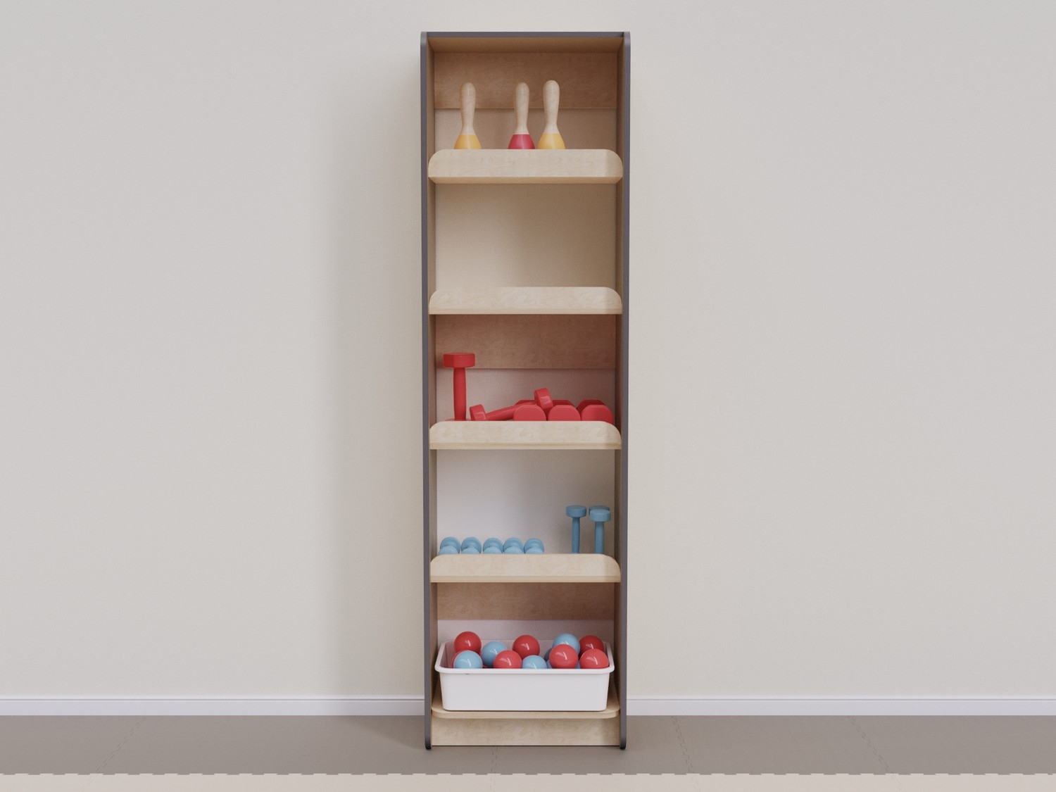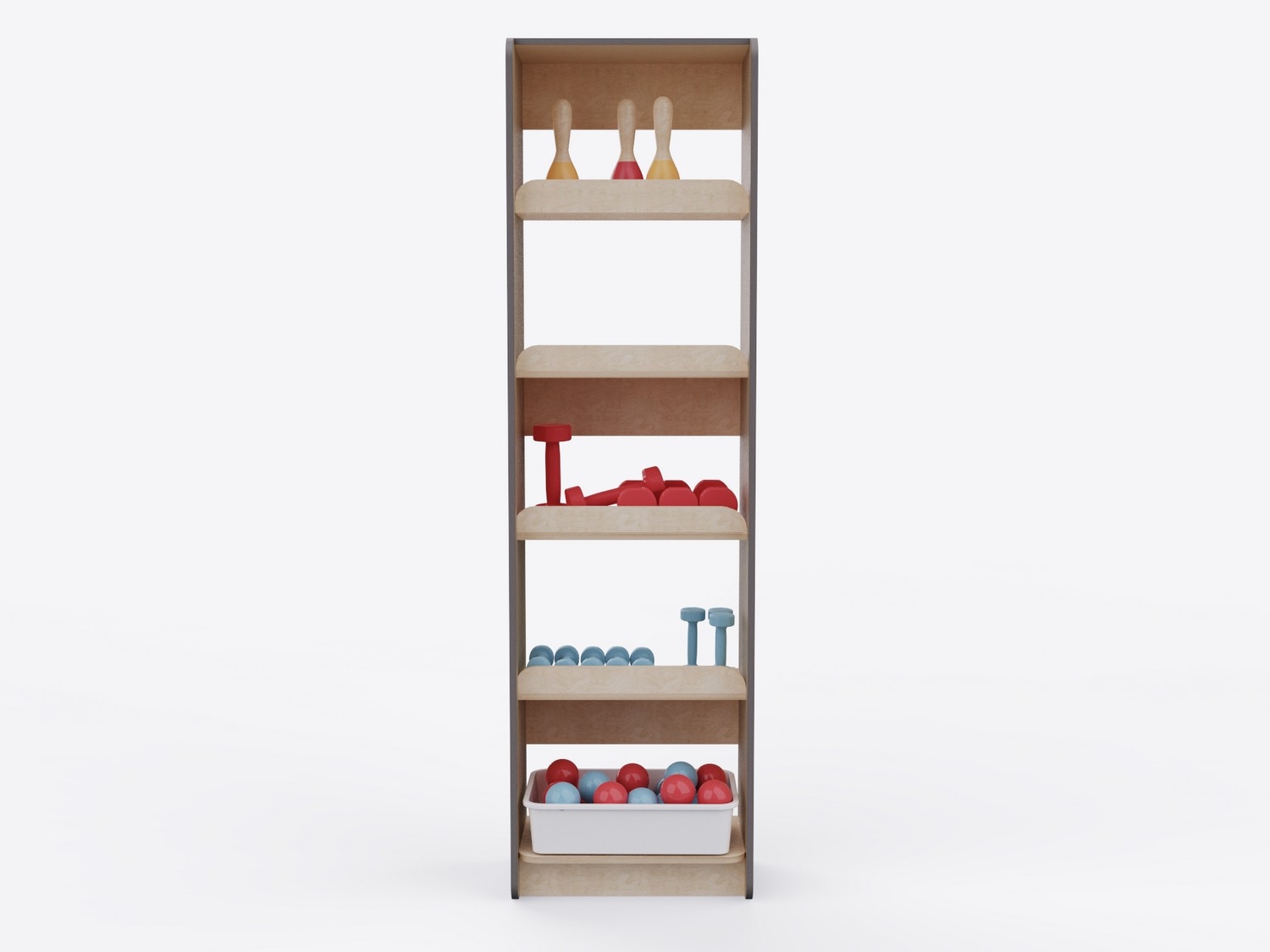 Стеллаж выполнен из высококачественных и прочных материалов, безопасных для использования детьми. Соответствует актуальным ГОСТам на детскую мебель и инвентарь для спортивных залов, требованиям СанПиН и пожарной безопасности, рекомендациям ФОП ДО по созданию развивающей среды для детей. Гладкие поверхности просты в уходе: достаточно влажной уборки для поддержания высокого уровня гигиены.
