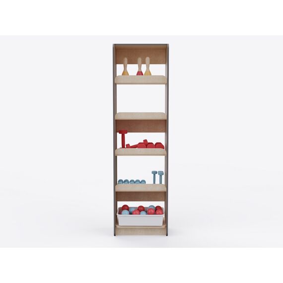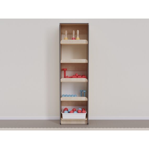 Стеллаж с полками, рабочая глубина которых составляет 30 см, а высота — 36,5 см, разработан для хранения разного спортивного инвентаря. Бортик в 6 см препятствует случайному падению предметов с полки.