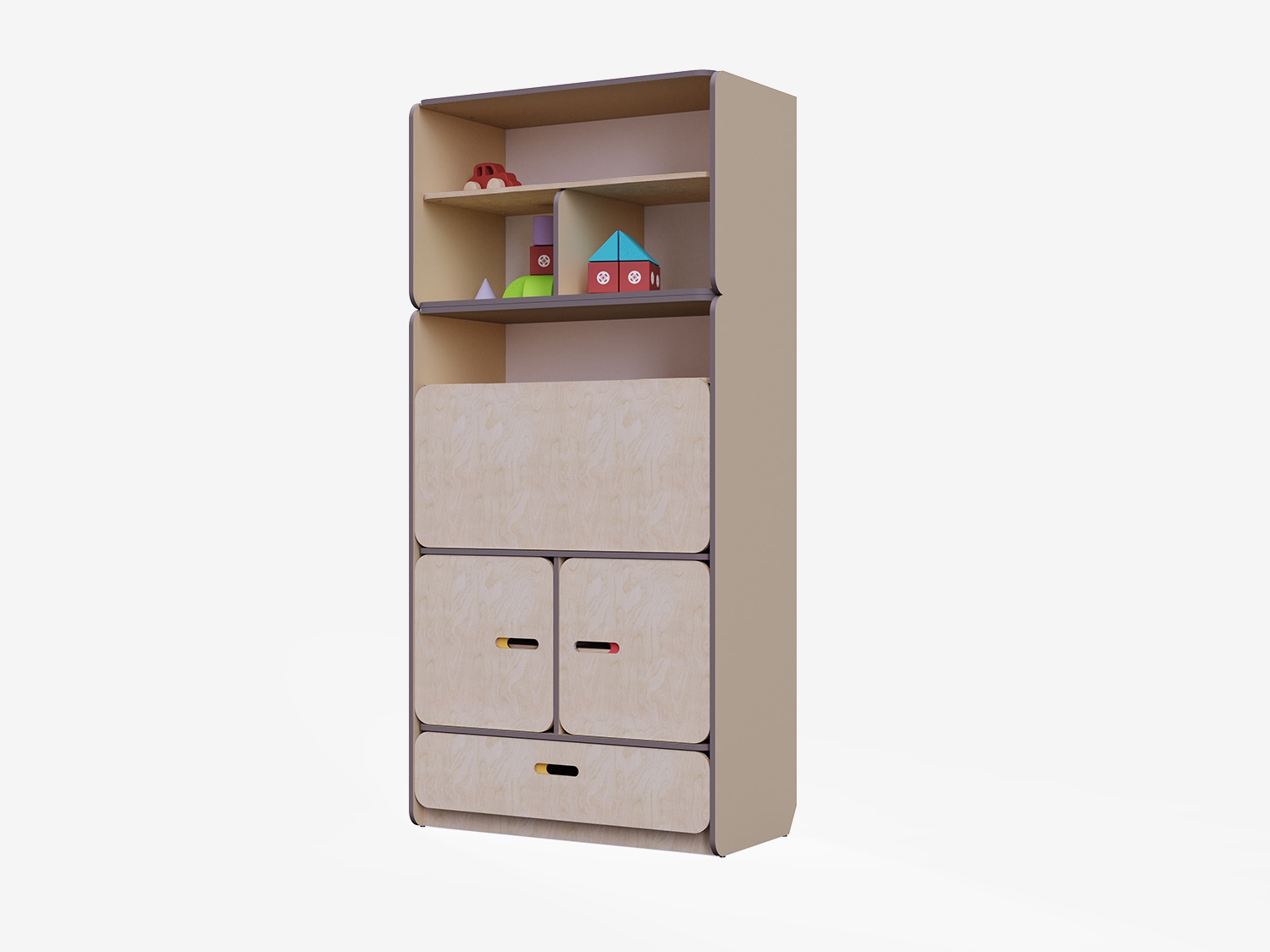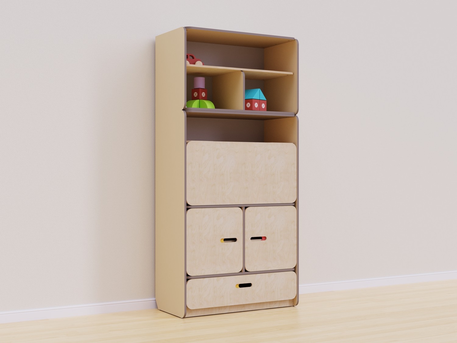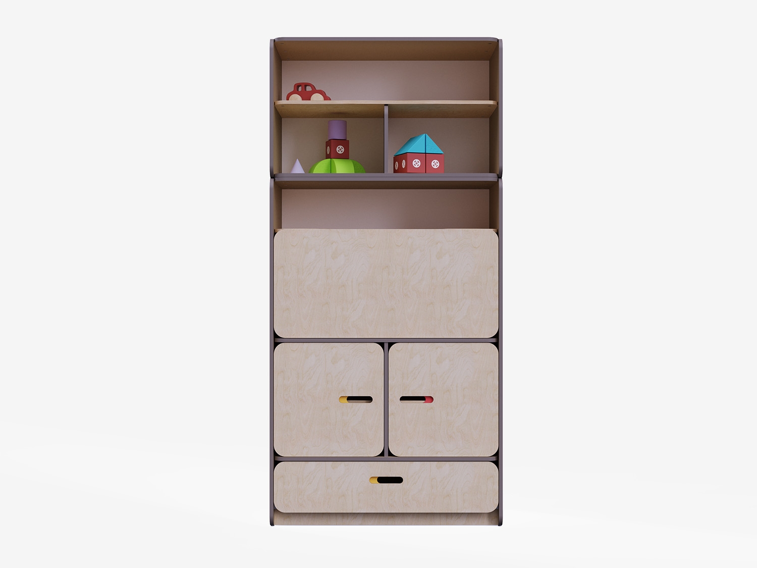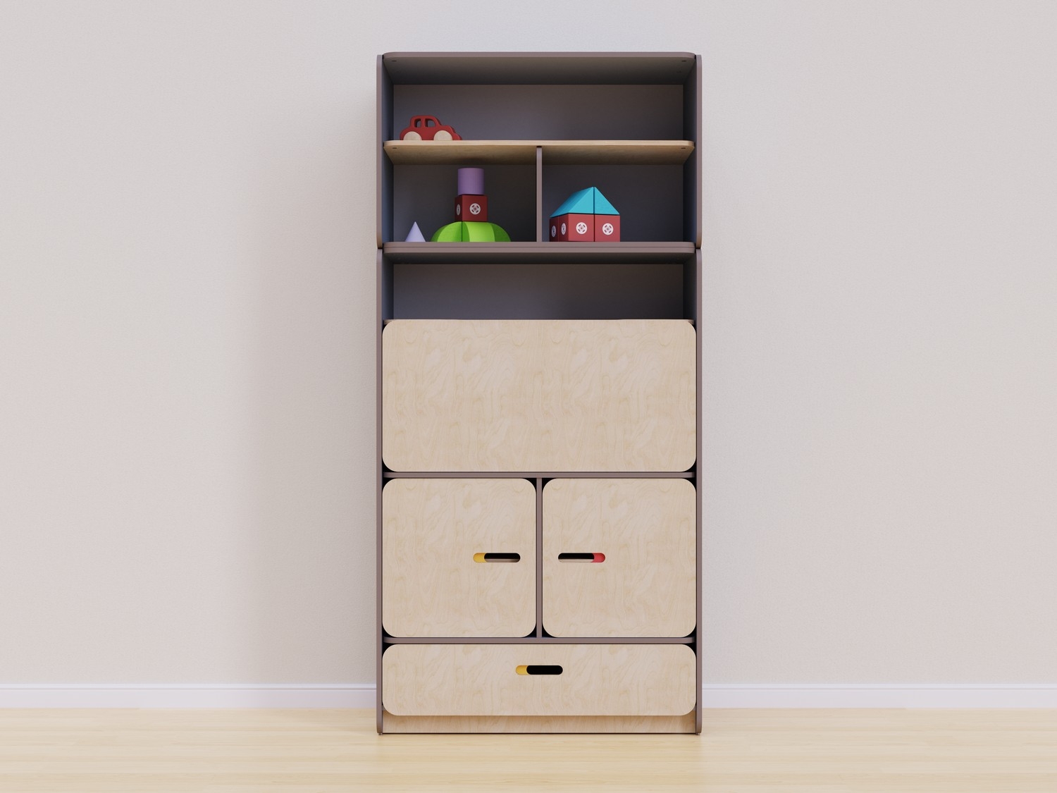 Конструкция стеллажа разработана с учетом всех стандартов безопасности. Встроенные шкафы с дверцами обеспечивают безопасное хранение мелких предметов и игрушек, предотвращая доступ к ним детей без присмотра взрослых. Три средних секции закрываются на замок для удобного размещения рабочих материалов, аптечки и других вещей, которые необходимо спрятать от детей.