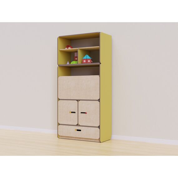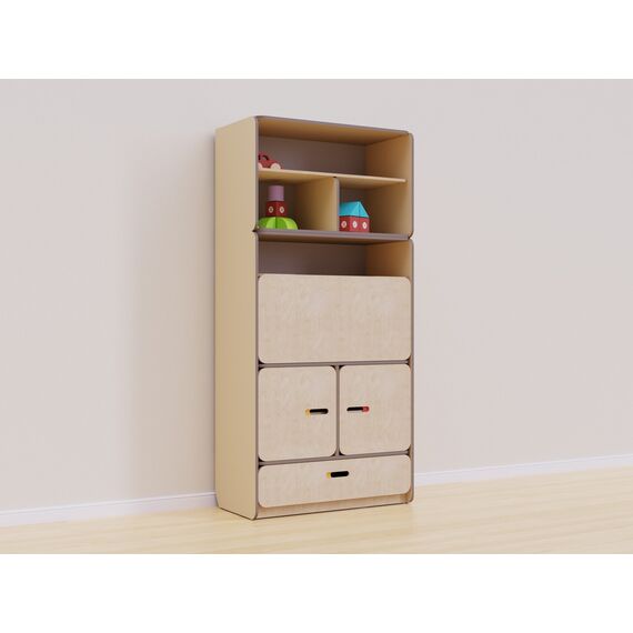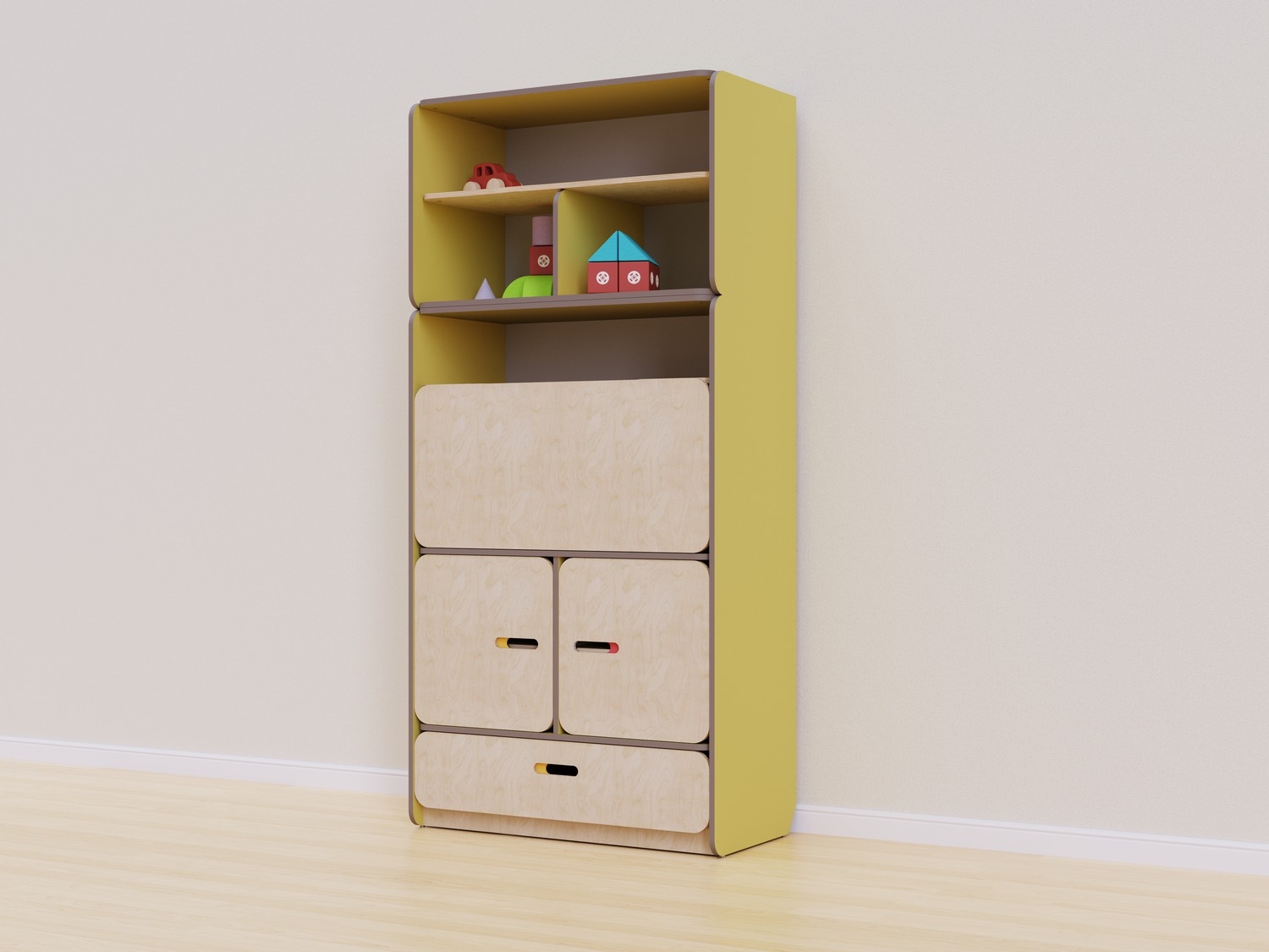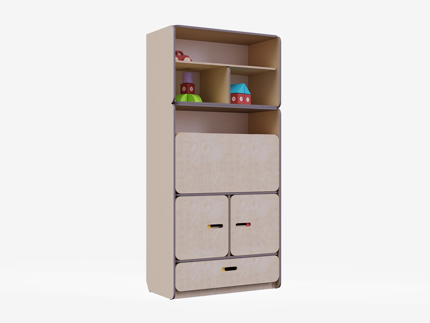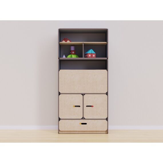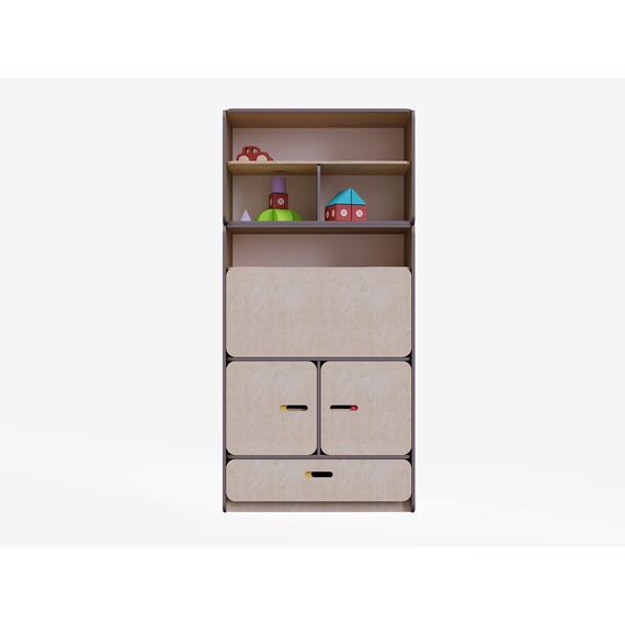 Конструкция стеллажа разработана с учетом всех стандартов безопасности. Встроенные шкафы с дверцами обеспечивают безопасное хранение мелких предметов и игрушек, предотвращая доступ к ним детей без присмотра взрослых. Три средних секции закрываются на замок для удобного размещения рабочих материалов, аптечки и других вещей, которые необходимо спрятать от детей.