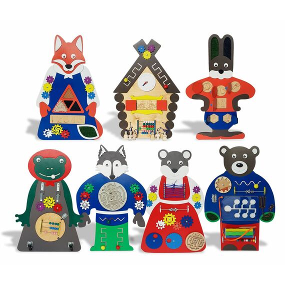 Набор бизибордов "Любимая сказка" - это серия небольших деревянных логических игр. Каждая игра представляет собой панель с различными движущимися элементами, которые нужно перемещать, чтобы решить логическую задачу. Игры выполнены в виде зверушек из сказки "Теремок", таких как медведь, волк, лиса, заяц, мышка, лягушка и избушка-теремок. Каждый зверушка имеет свои задачи: волк поможет научиться считать, а лисичка покажет, как найти выход из лабиринта. Кроме того, панели выполнены из качественной фанеры, покрыты яркими красками и имеют привлекательный дизайн. Этот набор бизибордов - отличный способ развивать логическое мышление детей и знакомить с сказками.