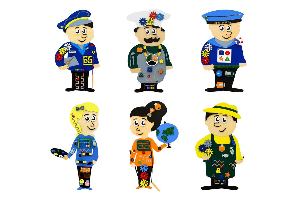 Набор состоит из 6 бизибордов, выполненных в виде разных профессий: почтальон, повар, моряк, художник, учитель и садовник. Каждый персонаж стилизован в соответствии с профессией и имеет милый, добродушный вид. Каждый бизиборд оснащен элементами, способствующими развитию и обучению детей: замочки, песочные часы, дорожки, лабиринты, счеты и другие. Игровой набор может использоваться в различных детских учреждениях и развлекательных центрах.