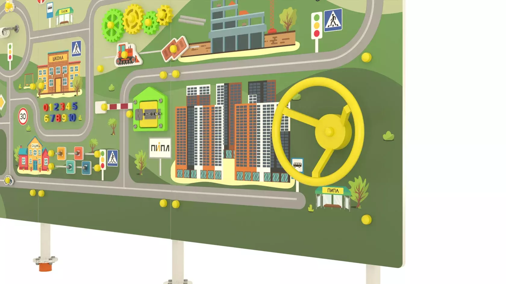 - Безопасность и надежность – все элементы (шестеренки, защелки, шлагбаум и др.) закреплены прочно, без острых углов, соответствуют требованиям для детских уличных конструкций.