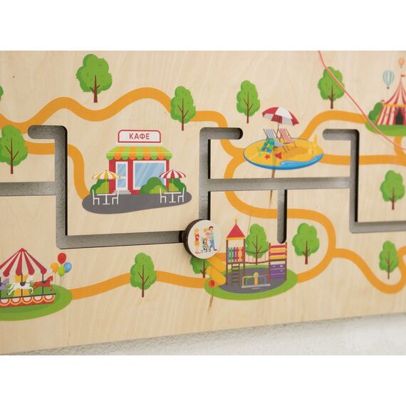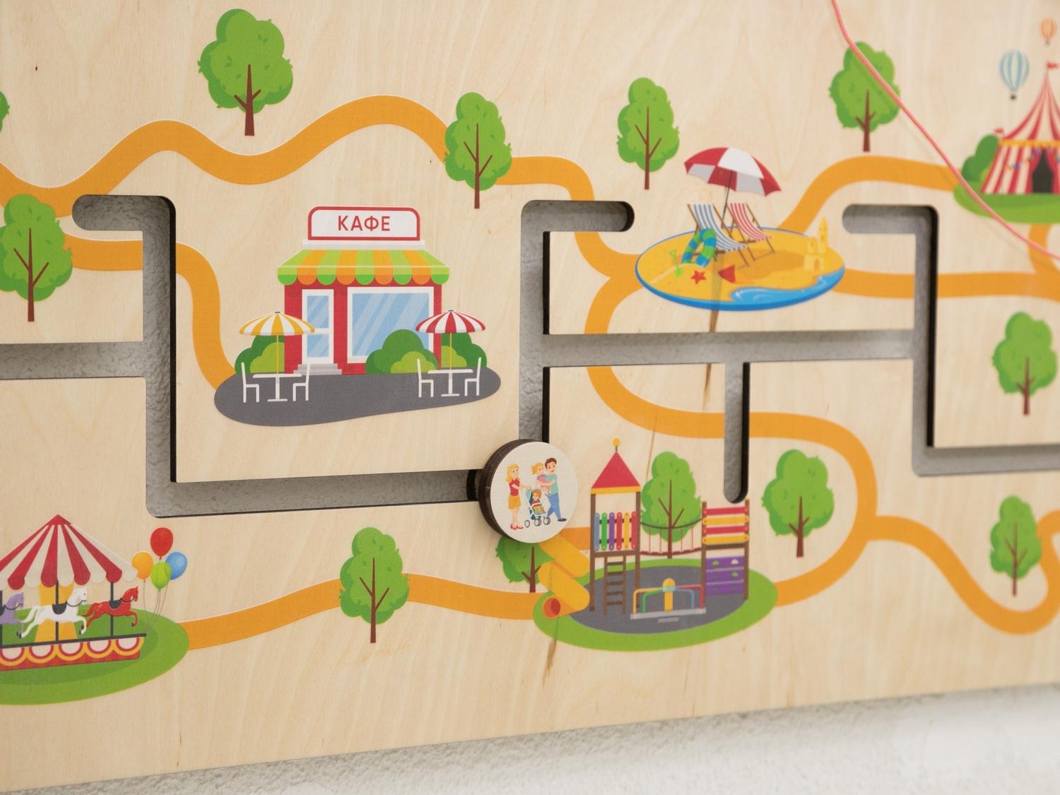 - Интерактивный лабиринт «Досуг семьи» с изображением различных локаций для совместного активного отдыха, спортивных занятий и культурного времяпровождения в кругу семьи (960х300 мм)