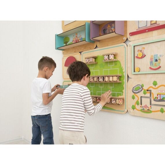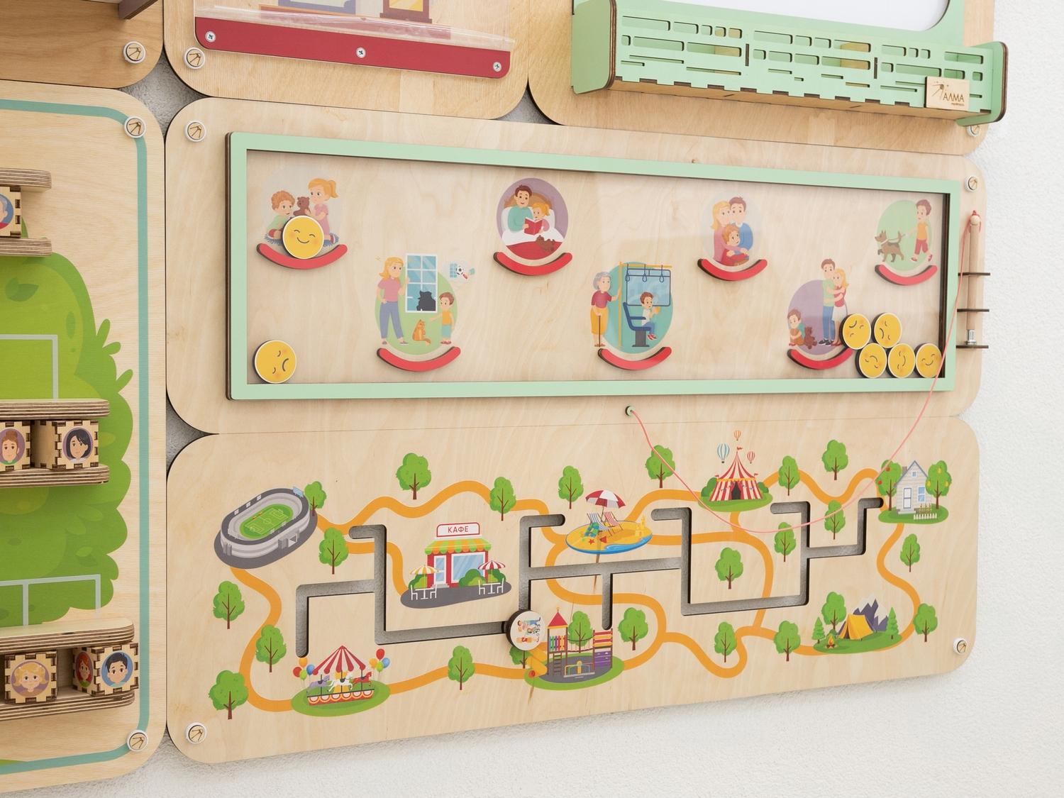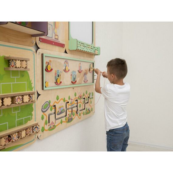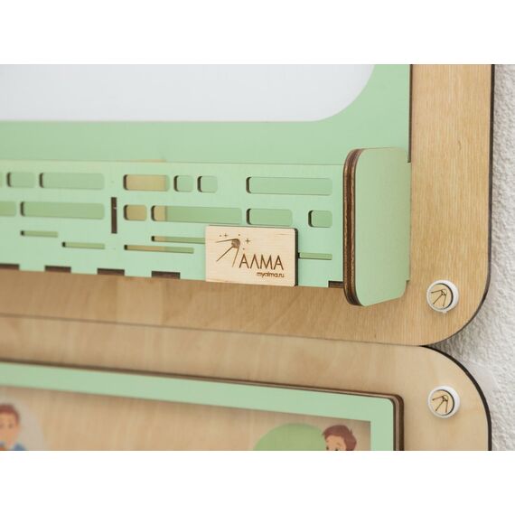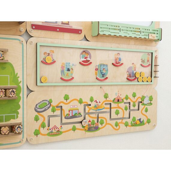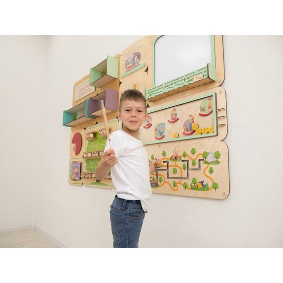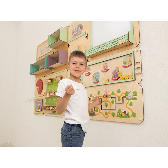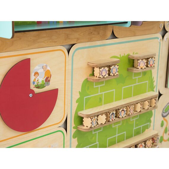 Панель оснащена надежной скрытой системой креплений. Все элементы изготовлены из высококачественных экологичных материалов, соответствующих стандартам качества и безопасности. Иллюстрации выполнены с помощью принтерной печати и покрыты защитным прозрачным лаком, он устойчив к воспламенению и защищает поверхность от стирания. Все детали прочно закреплены на панели.