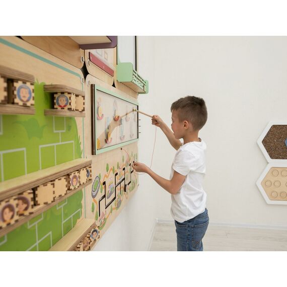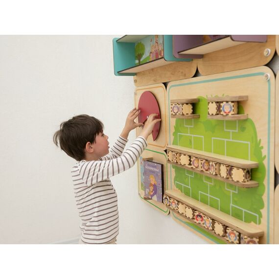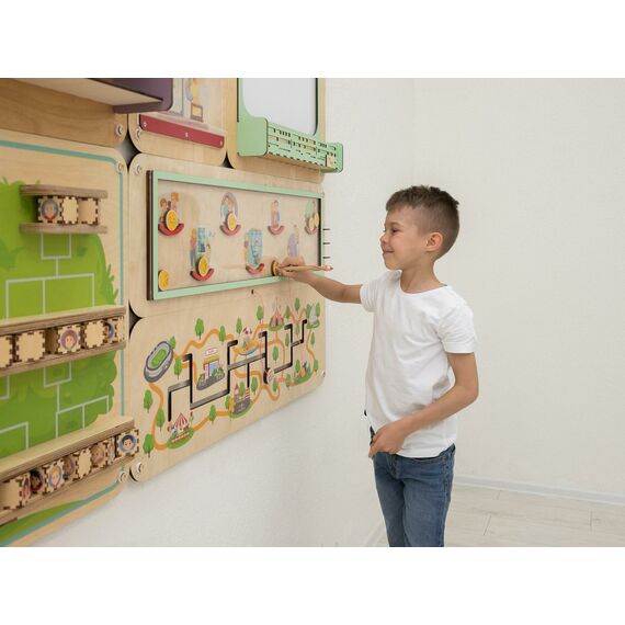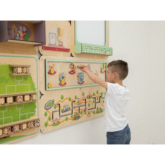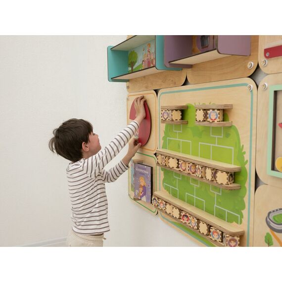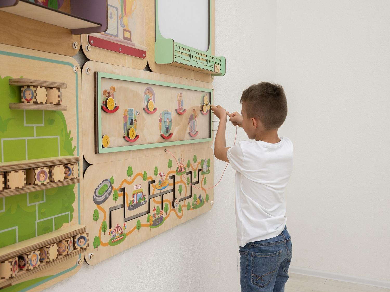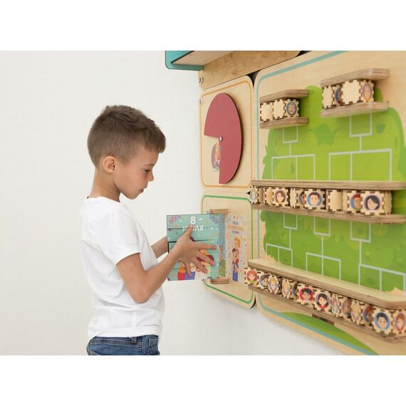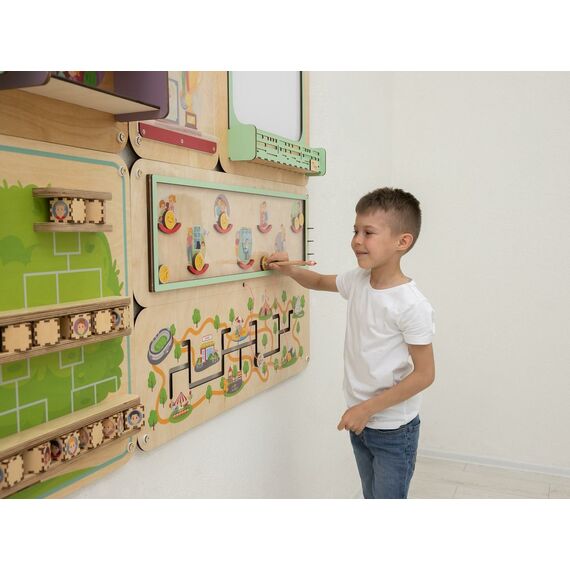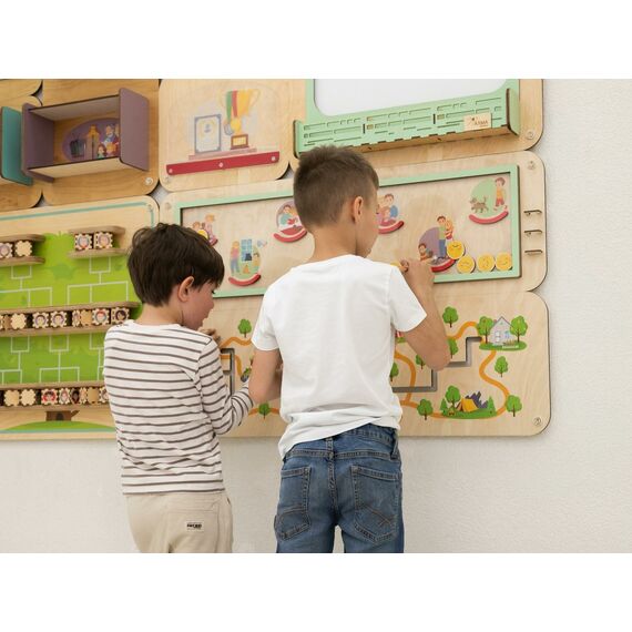 Панель оснащена надежной скрытой системой креплений. Все элементы изготовлены из высококачественных экологичных материалов, соответствующих стандартам качества и безопасности. Иллюстрации выполнены с помощью принтерной печати и покрыты защитным прозрачным лаком, он устойчив к воспламенению и защищает поверхность от стирания. Все детали прочно закреплены на панели.