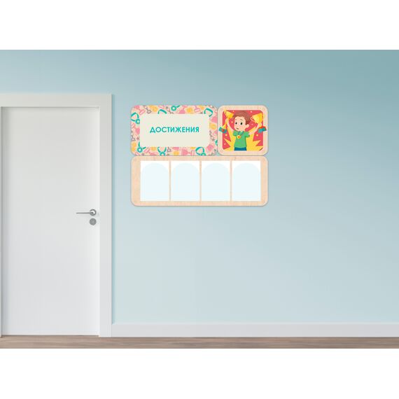 Стенд информации для детского сада, который рассказывает учащимся и родителям о детских достижениях. В акриловых карманах можно разместить грамоты, дипломы, списки победителей и многое другое. Яркий заголовок акцентирует внимание посетителей на этой информации.
