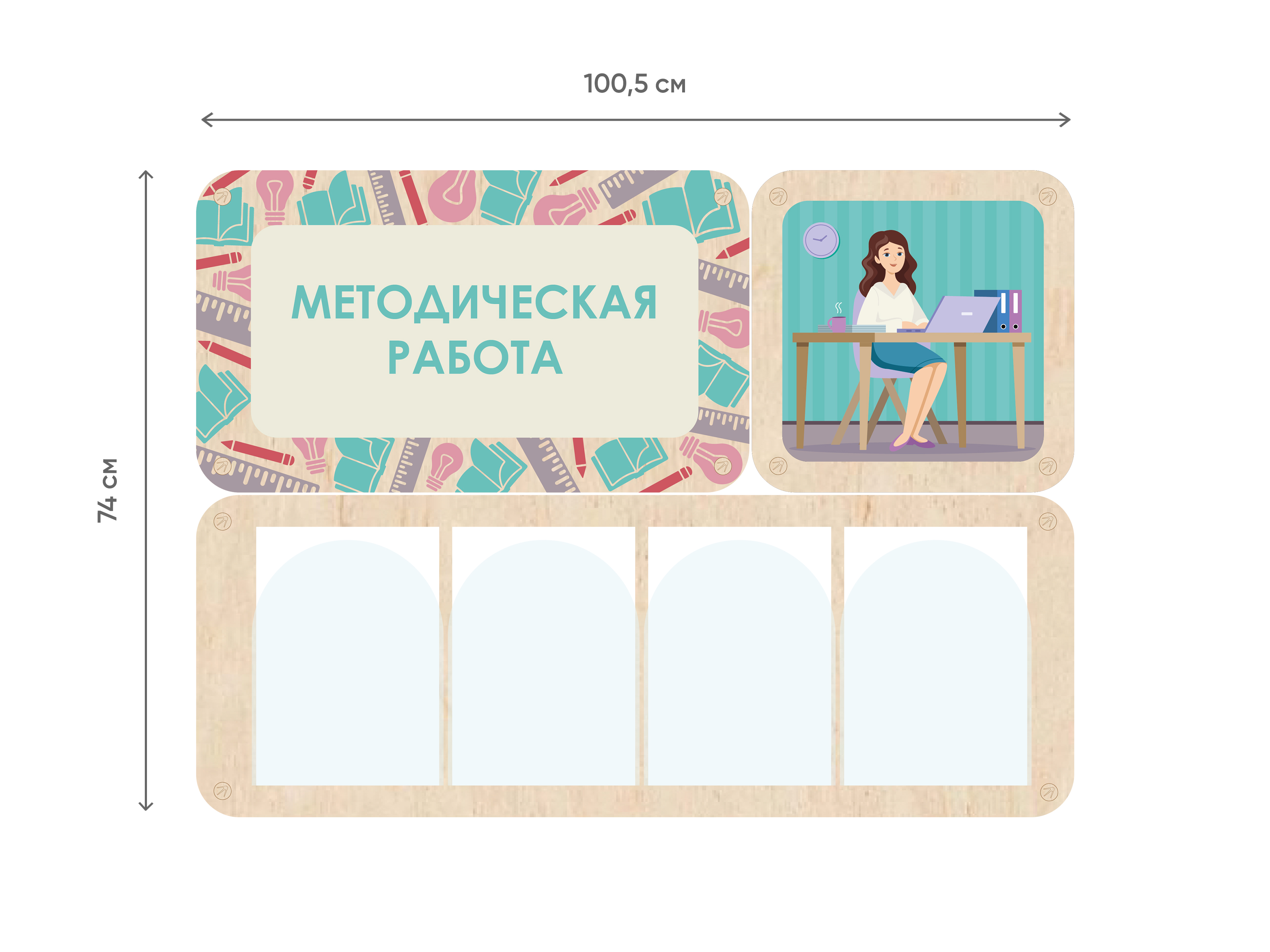 Стенды выполнены из качественной берёзовой фанеры, сверху нанесена UF-печать стойкими к выцветанию красками без запаха. Крепления надёжно спрятаны, углы конструкции скруглены для уменьшения травматизма. Изделие легко подвергается сухой и влажной уборке.