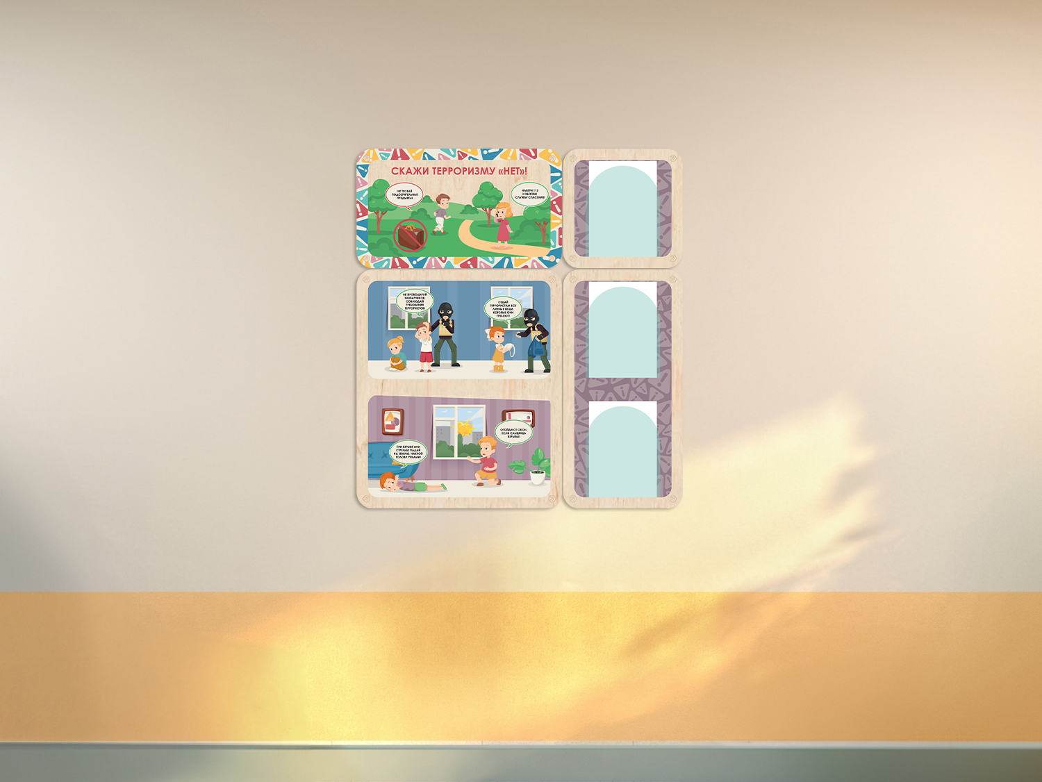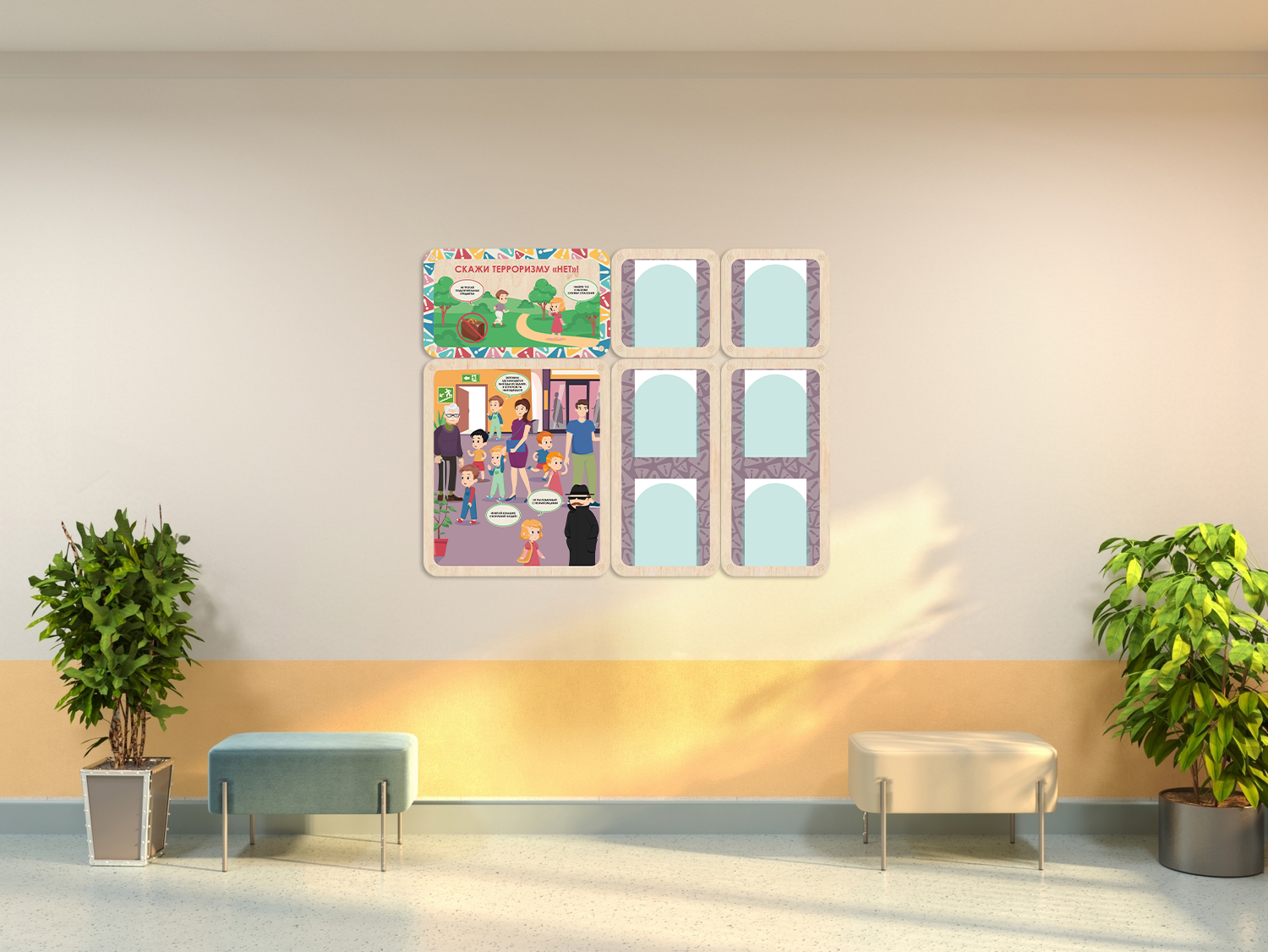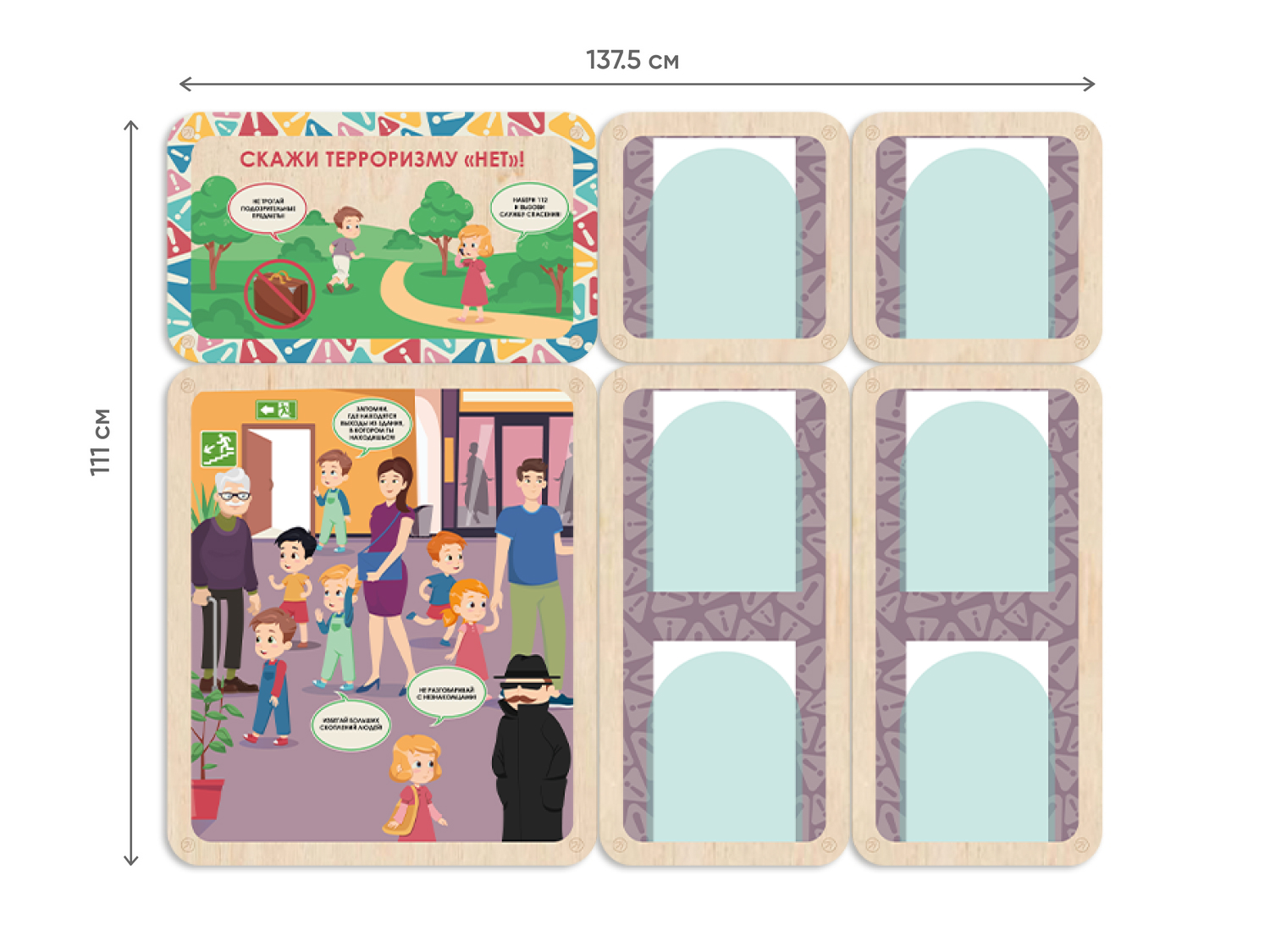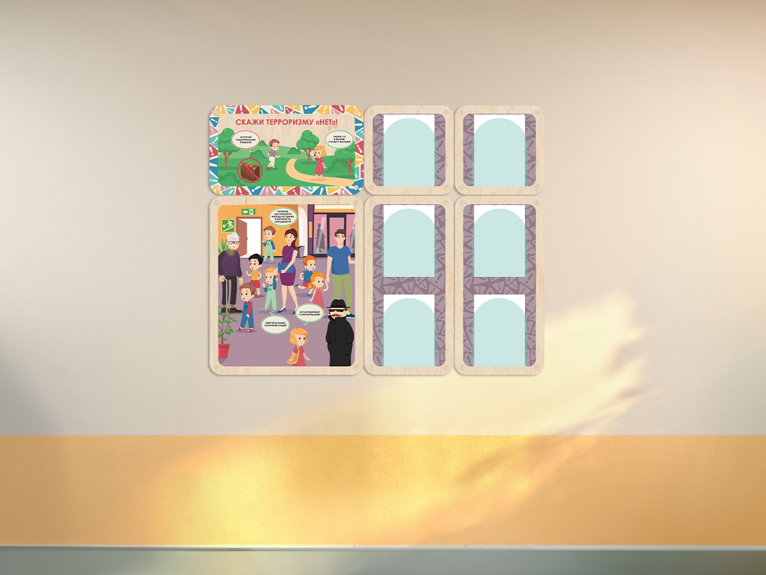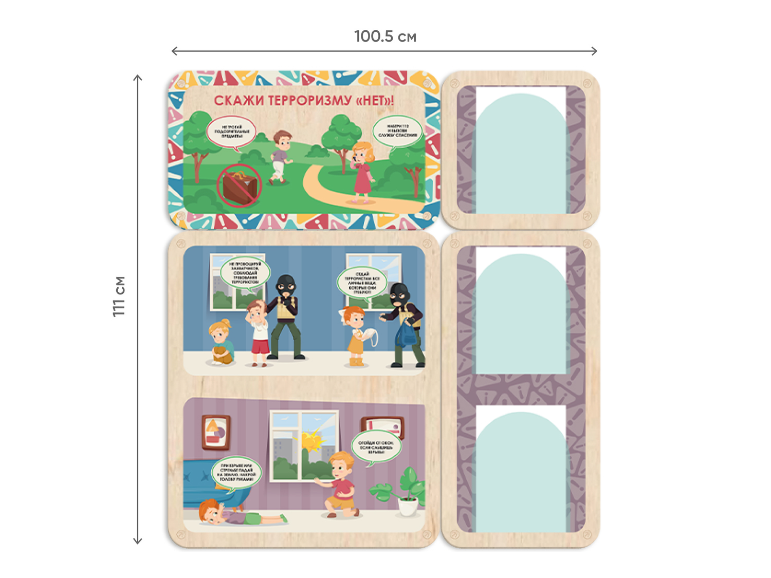 Информационный стенд для оформления стен в детских садах, начальной школе и организациях дополнительного образования. Красочные наглядные иллюстрации с простыми подписями помогут дошколятам понять правила поведения при терроризме, даже если они ещё не умеют читать. Важная информация для родителей может размещаться в акриловых карманах около каждого стенда.