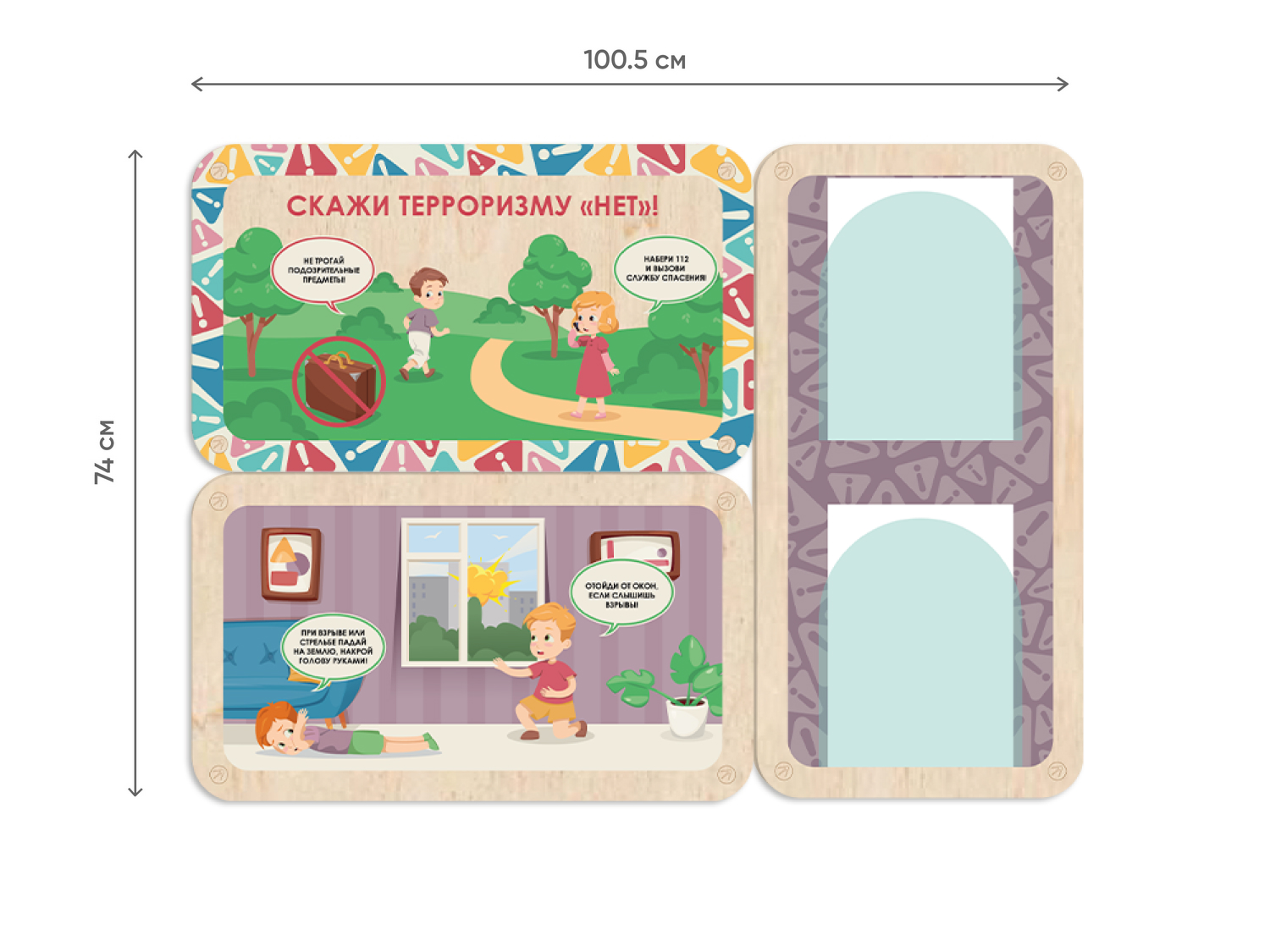 Стенды выполнены из качественной берёзовой фанеры, сверху нанесена UF-печать стойкими к выцветанию красками без запаха. Крепления надёжно спрятаны, углы конструкции скруглены для уменьшения травматизма. Изделие легко подвергается сухой и влажной уборке.