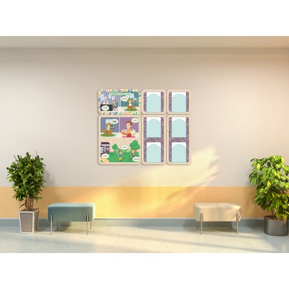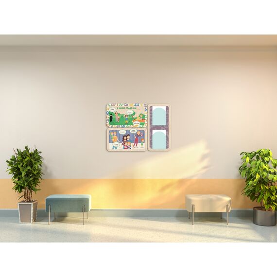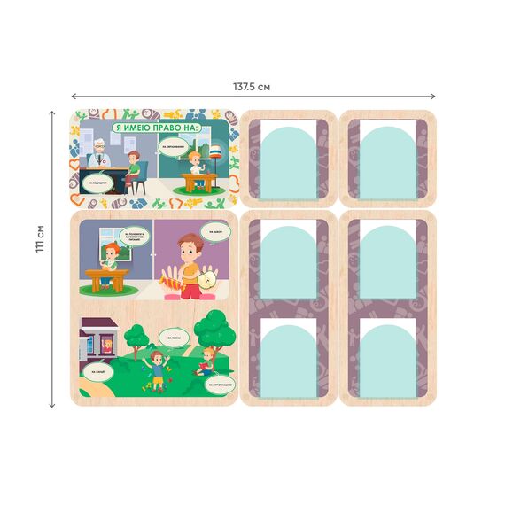 Панели информационных стендов выполнены из экологичной берёзовой фанеры, рисунок нанесён с помощью UF-печати стойкими к выцветанию красками, не имеющими неприятного запаха. Углы панели скруглены, крепления к стене скрыты декоративными заглушками для безопасности ребёнка. Стенды можно очищать сухой и влажной тканью.