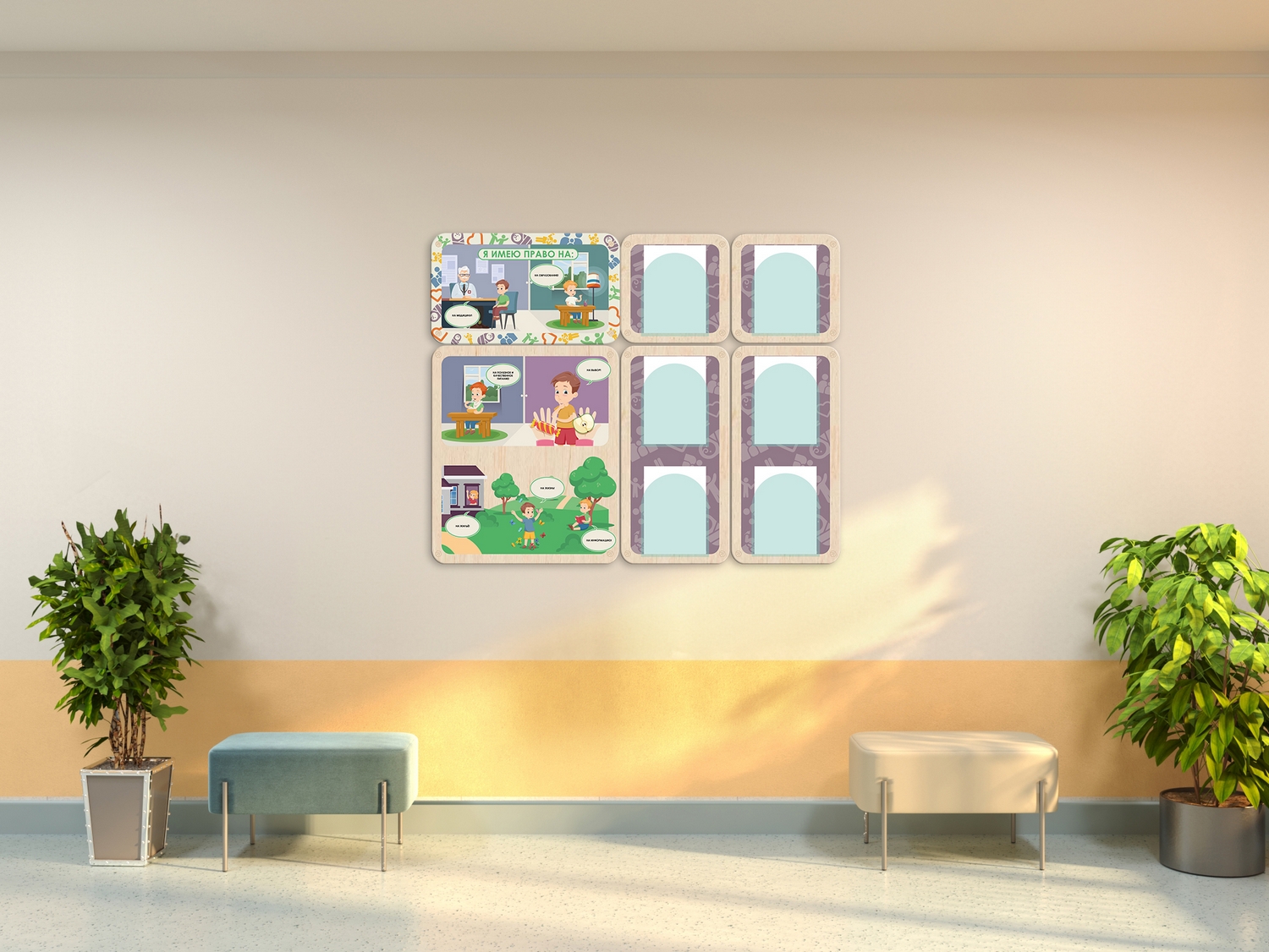 Панели информационных стендов выполнены из экологичной берёзовой фанеры, рисунок нанесён с помощью UF-печати стойкими к выцветанию красками, не имеющими неприятного запаха. Углы панели скруглены, крепления к стене скрыты декоративными заглушками для безопасности ребёнка. Стенды можно очищать сухой и влажной тканью.