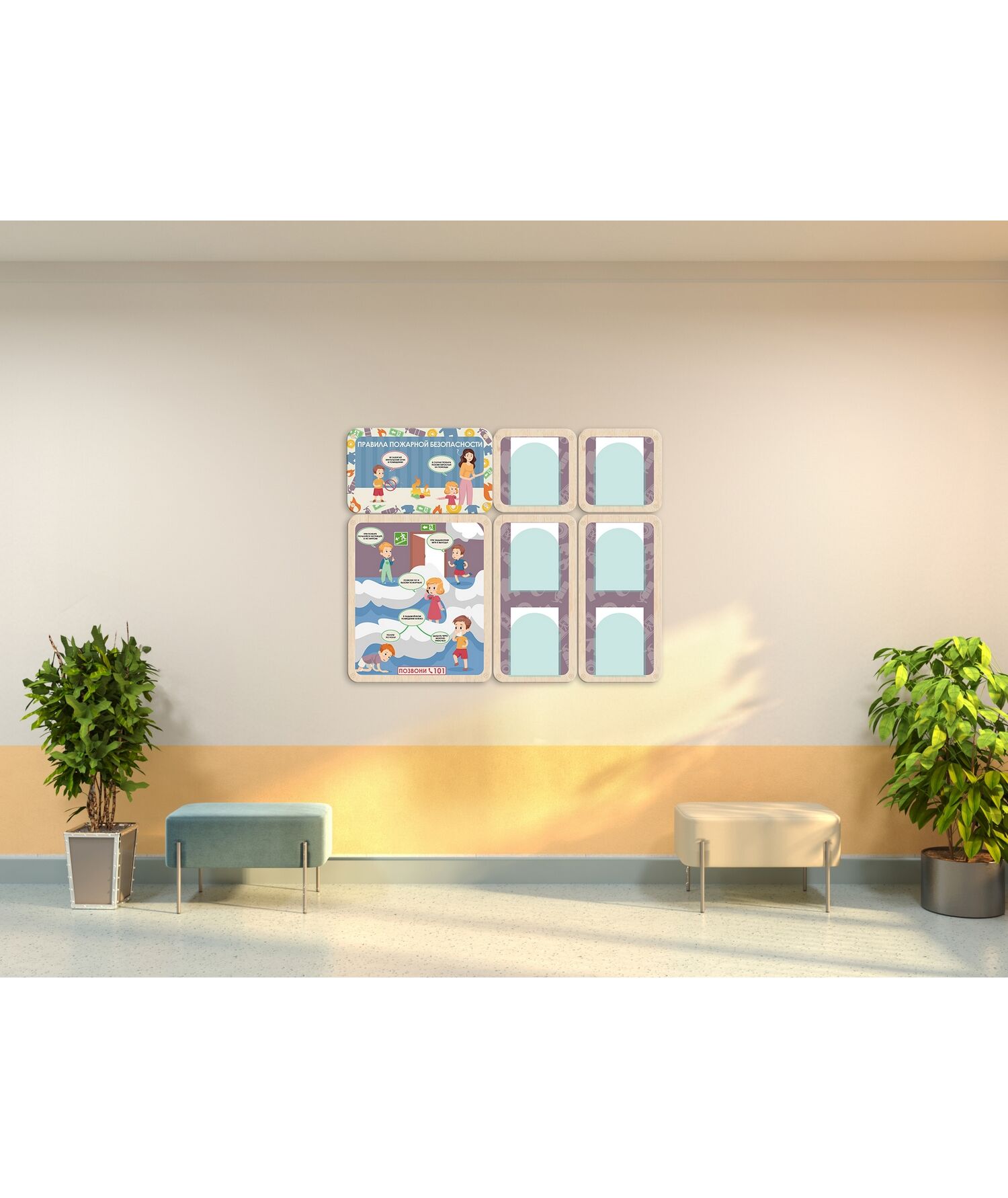 Стенды для оформления стен в ДОУ, наглядно объясняющие дошколятам правила пожарной безопасности. Красочные картинки с простыми подписями понятны большинству детей, а для родителей есть важная печатная информация, размещаемая в прозрачных акриловых карманах.