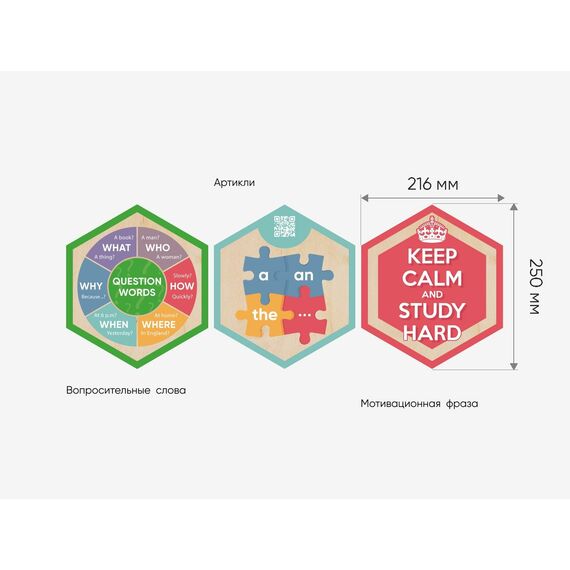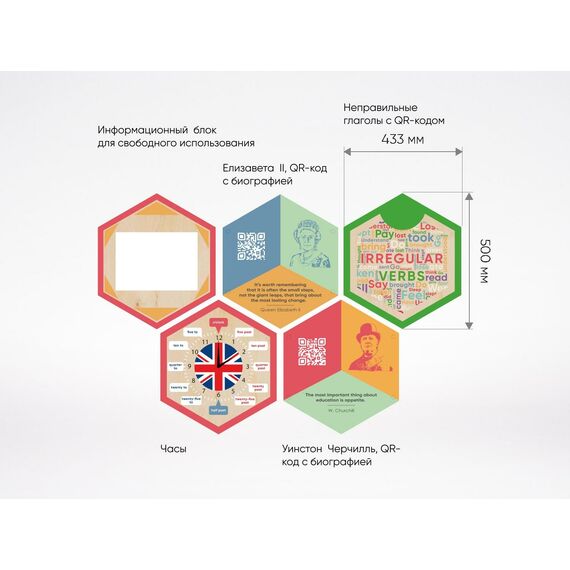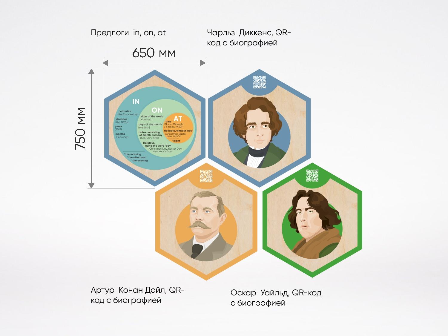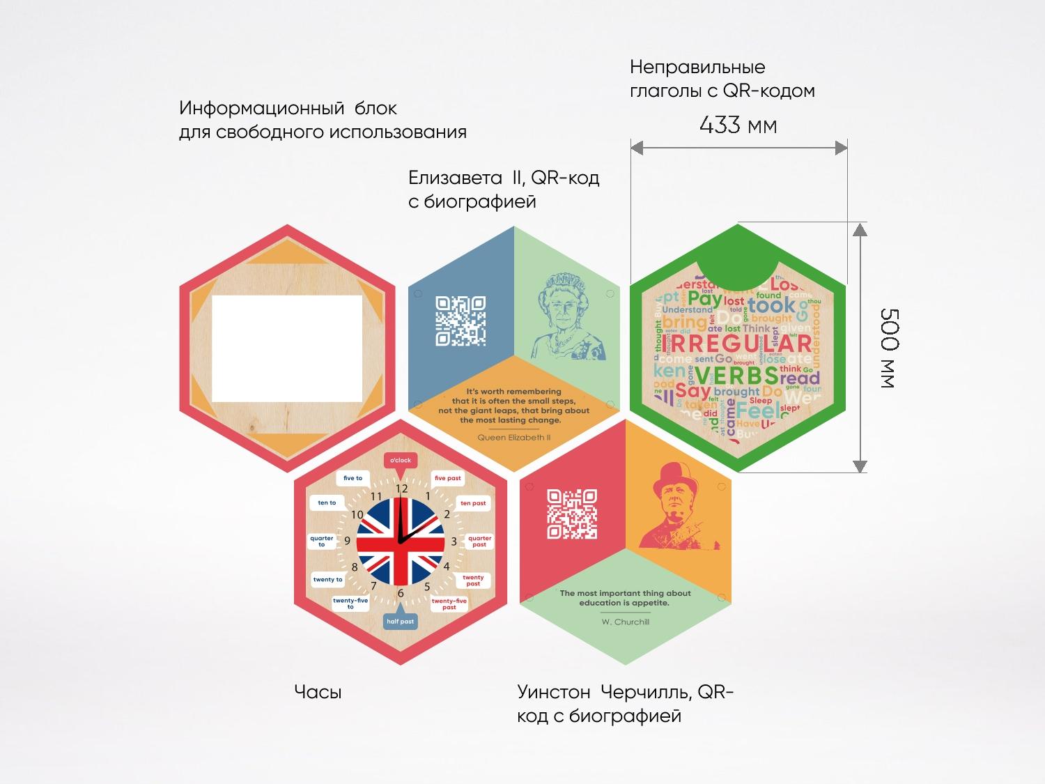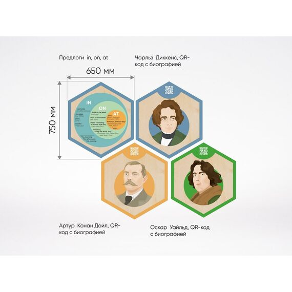 В комплект входит 13 шестигранников разных размеров. Каждый содержит обучающую информацию. Благодаря QR-кодам дети могут подробнее узнать о выдающихся личностях, изображённых на портретах, правила и интересные факты - стоит только навести на них телефон.