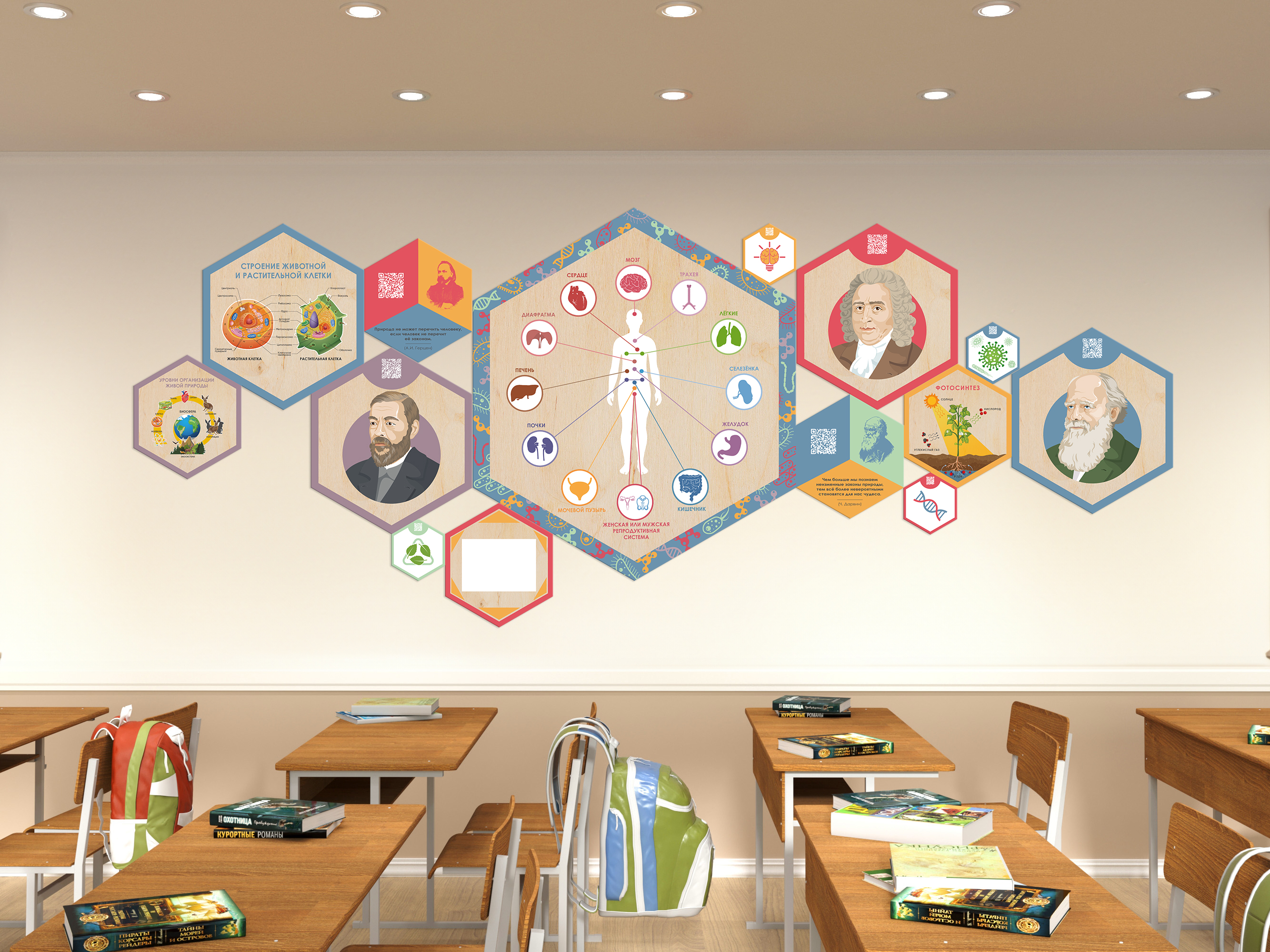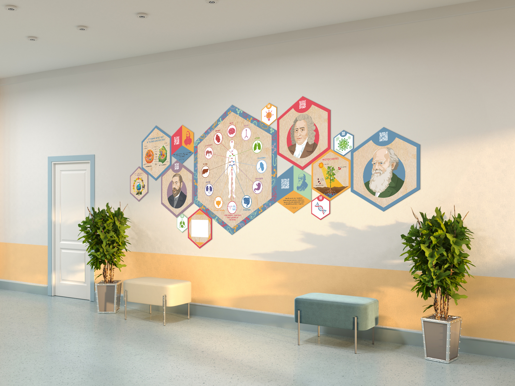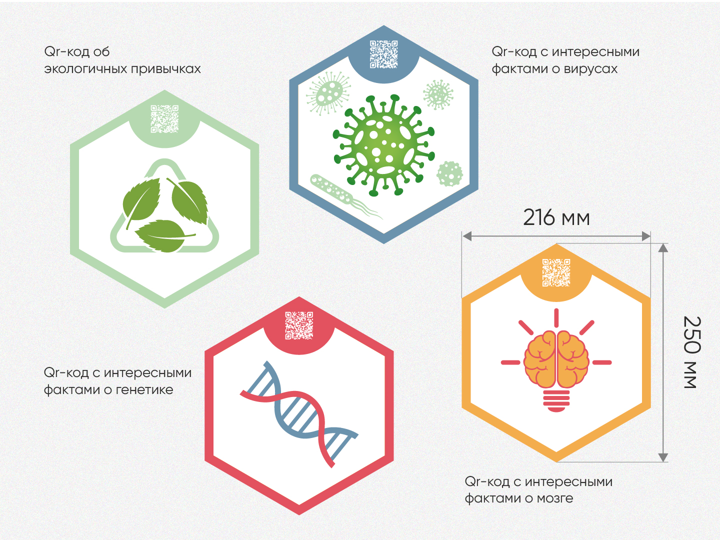 Каждый шестигранник содержит обучающую информацию: портреты выдающихся людей, их достижения и великие цитаты, основные постулаты науки, формулы, графики, теоремы. Благодаря qr-кодам дети могут подробнее узнать об учёных, изображённых на портретах, стоит только навести на них телефон.