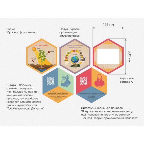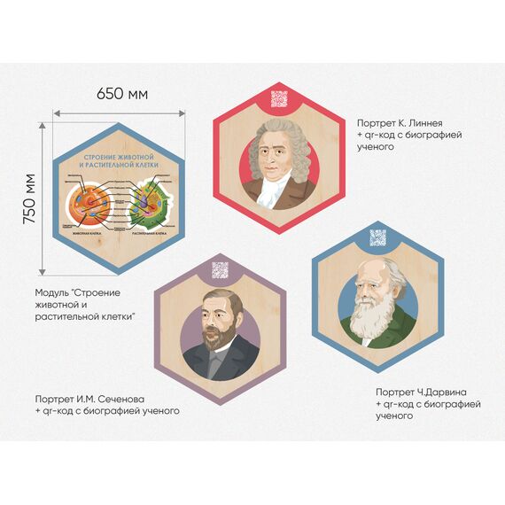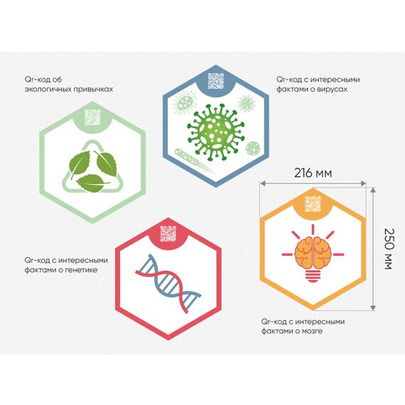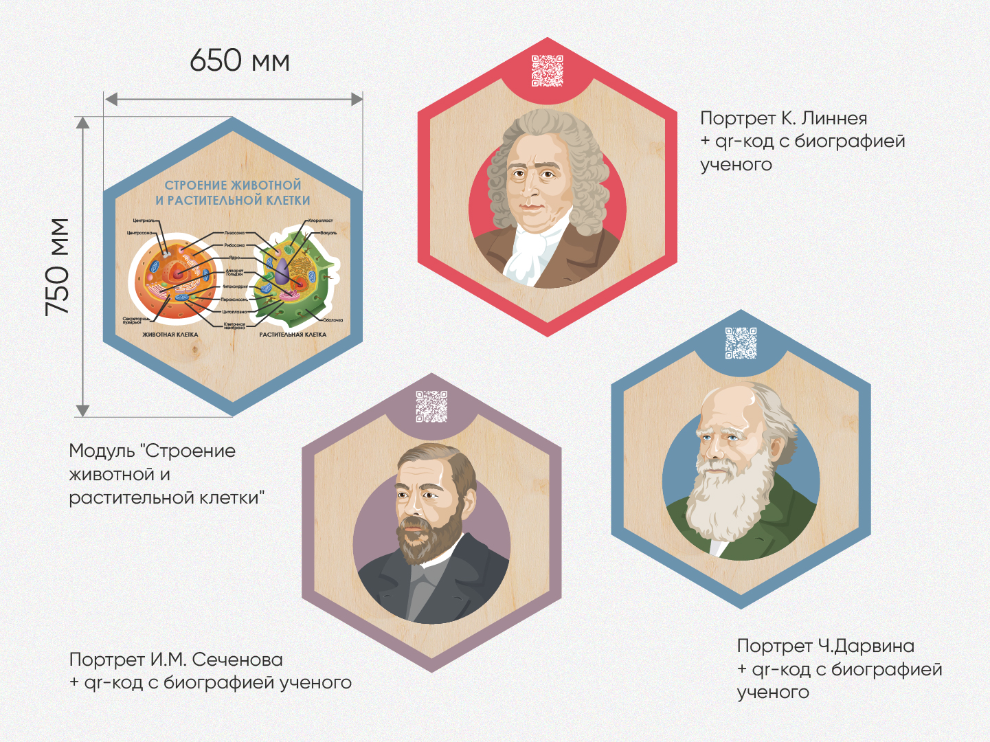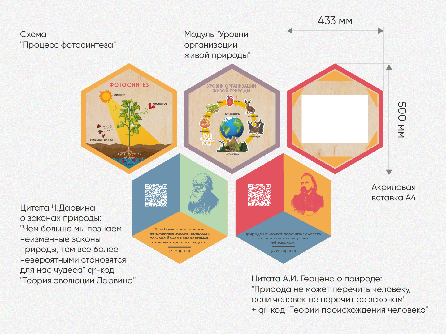 Каждый шестигранник содержит обучающую информацию: портреты выдающихся людей, их достижения и великие цитаты, основные постулаты науки, формулы, графики, теоремы. Благодаря qr-кодам дети могут подробнее узнать об учёных, изображённых на портретах, стоит только навести на них телефон.