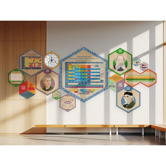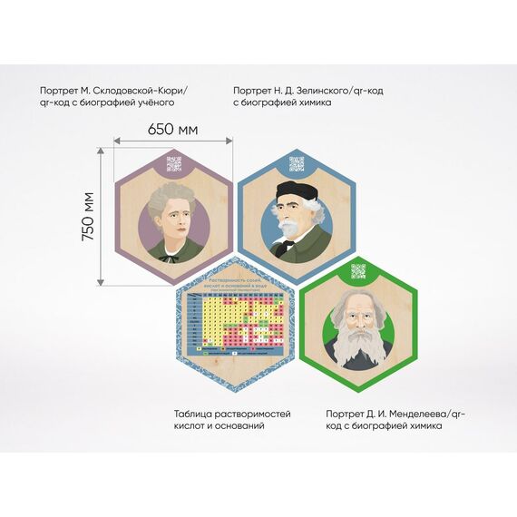 В комплекте содержит 14 шестигранников разных размеров. Каждый содержит обучающую информацию: портреты выдающихся людей, их достижения и великие цитаты, формулы, таблицы. Благодаря qr-кодам дети могут подробнее узнать об учёных, изображённых на портретах, стоит только навести на них телефон.