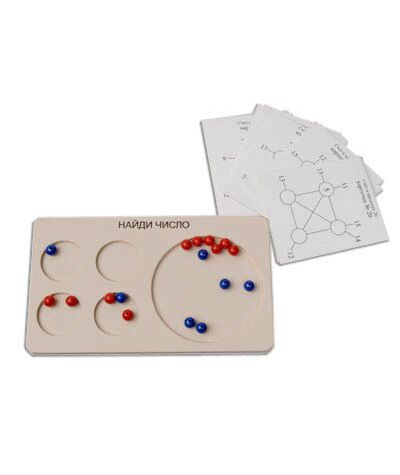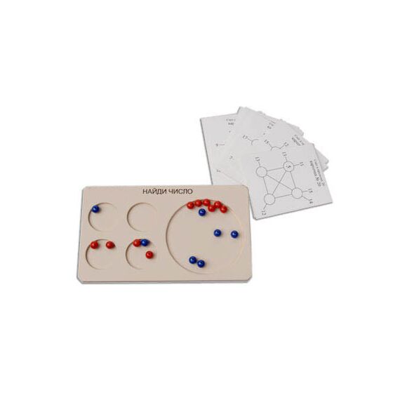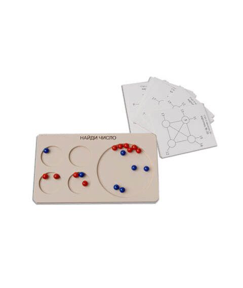 Игровое поле представляет собой пластину с четырьмя одинаковыми лунками и еще одной, большего диаметра. В большую лунку высыпают красные и синие шарики. Красные шарики обозначают число "1", синие – "5", что сделано для удобства представления больших чисел (так число 19 можно представить тремя синими шариками и четырьмя красными). Необходимо разложить шарики в соответствии с указанными на карточке суммами чисел в лунках (в столбцах, строках и по диагоналям) и числом в одной лунке. Карточки напечатаны на картоне и ламинированы глянцевой пленкой.