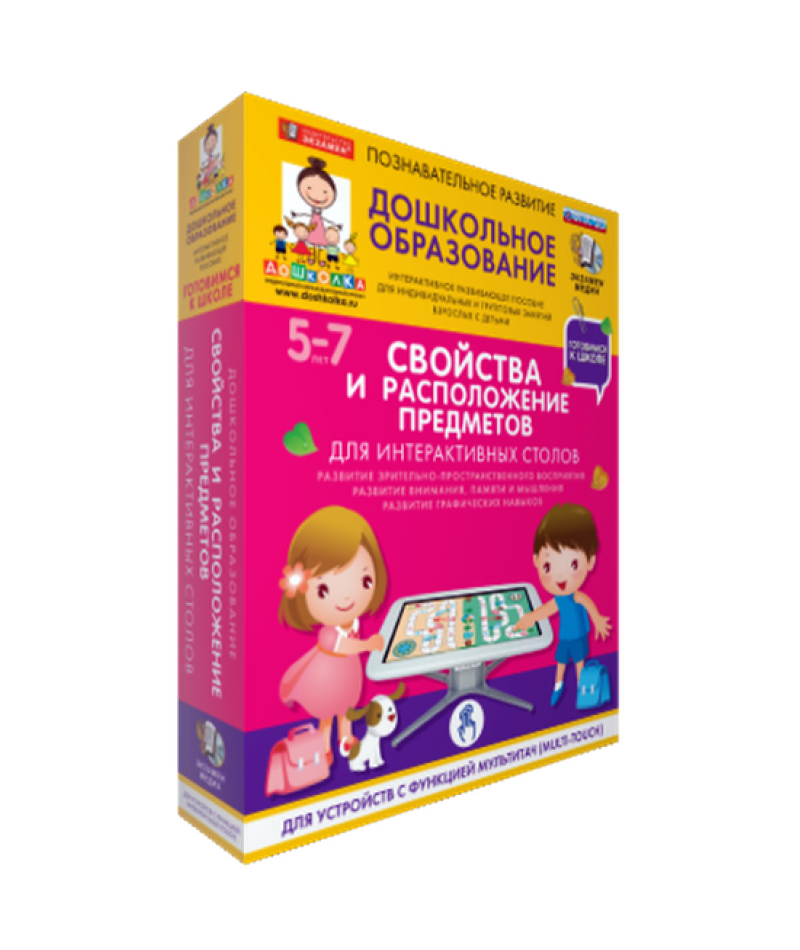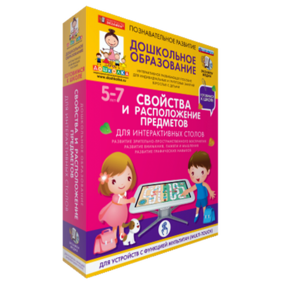 ГОТОВИМСЯ К ШКОЛЕ. СВОЙСТВА И РАСПОЛОЖЕНИЕ ПРЕДМЕТОВ.ДЛЯ ИНТЕРАКТИВНЫХ СТОЛОВ - интерактивное развивающие пособие направлено на познавательное развитие детей старшего дошкольного возраста. Комплексная деятельность с интерактивным пособием охватывает все образовательные области, которые определены Федеральным государственным образовательным стандартом дошкольного образования (ФГОС ДО)