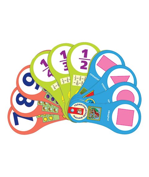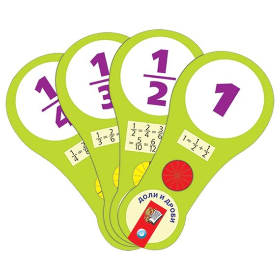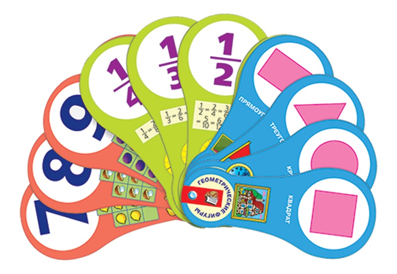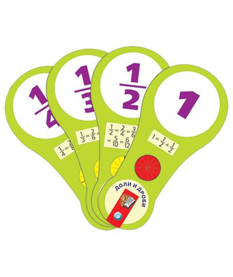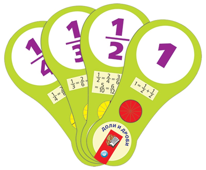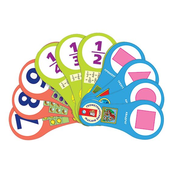 Наличие товара ДОУ. Комплект динамических раздаточных пособий по математике - средства обратной связи (веера).Устный счет, Доли и дроби, Геометрические формы.