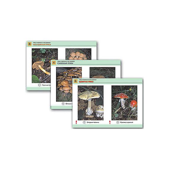Пособие состоит из 8 полноцветных таблиц, напечатанных на картоне и ламинированных глянцевой пленкой. Представлено 10 фотографий съедобных грибов (белый гриб, подберезовик, подосиновик, масленок, лисичка, сыроежка, опенок летний, опенок осенний, шампиньон, груздь черный), 4 фотографии ядовитых грибов (бледная поганка, мухомор красный, мухомор пантерный, сатанинский гриб) и 2 фотографии несъедобных грибов (перечный гриб, чешуйчатка огненная), указаны их видовые названия.