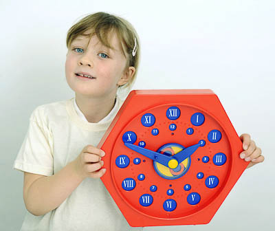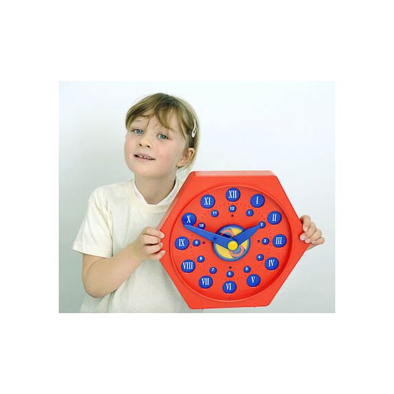 Набор обучающих часов, позволяющих детям понять переход от 12-ти часового обозначения времени до 24-х часового. Часы включают в себя двусторонний трафарет с обозначением времени как арабскими цифрами, так и римскими цифрами.