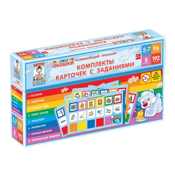 Набор состоит из 8 комплектов тематических карточек для среднего дошкольного возраста, каждый комплект состоит из 12 двухсторонних карточек, содержащих 24 задания по темам: