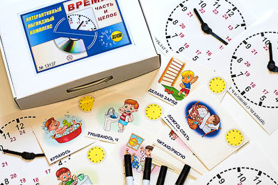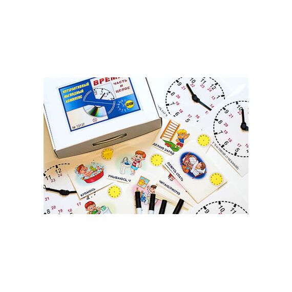 Комплектность: карточки «Режим дня» – 12 шт., карточки «Электронные часы» – 4 шт., карточки «Минуты» – 4 шт., циферблаты – 8 шт., маркеры на водной основе – 4 шт., интерактивное приложение на электронном носителе – 1 шт., руководство по эксплуатации – 1 шт.