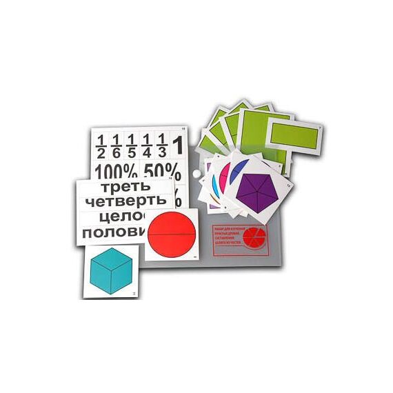 Комплектность: круг без разметки – 1 шт., круги, разделенные на 2, 3, 4, 5 и 6 равных частей – по 1 шт., трапеция, разделенная пополам – 1 шт., шестиугольник, разделенный на 3 равные части – 1 шт., квадрат, разделенный на 4 равные части – 1 шт., пятиугольник, разделенный на 5 равных частей – 1 шт., прямоугольники, разделенные на 3 равные части – 3 шт., прямоугольник большой– 1 шт., прямоугольник маленький – 1 шт., карточки "целое", "половина", "треть", "четверть", "1", "1/2", "1/3", "1/4", "1/5", "1/6", "100%", "50%", "25%", "20%" – по 1 шт., руководство по эксплуатации с методическими рекомендациями (количество рисунков - 9, количество заданий для учащихся - 11) – 1 шт.