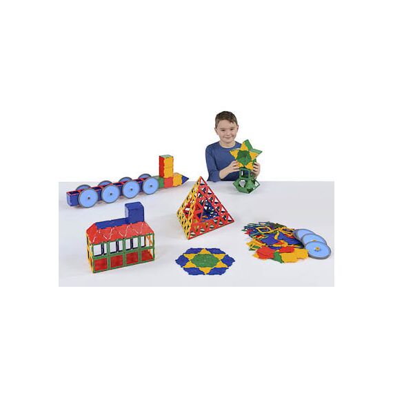 Набор для изучения основ математики, состоит из конструктивных элементов различных геометрических фигур цельного и каркасного типа 4-х различных цветов (синий, красный, зеленый, желтый).