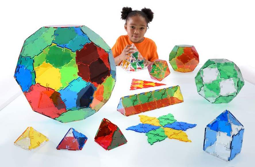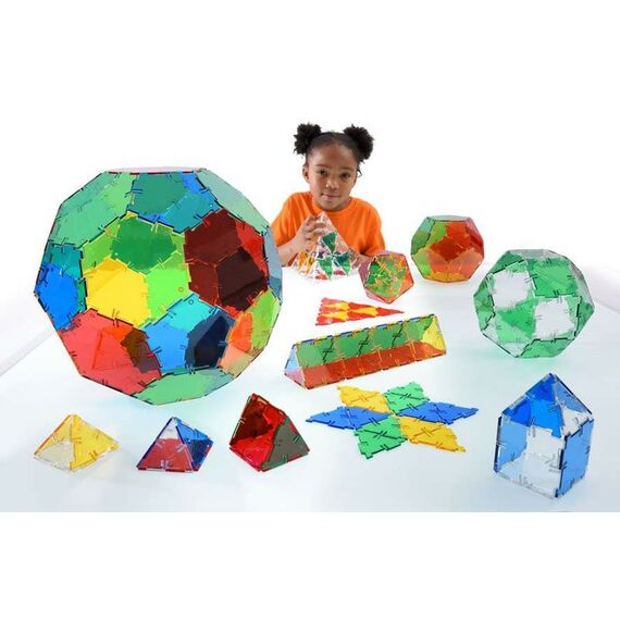 Предназначен для групповой игровой деятельности. При помощи этого конструктора дети в процессе игры смогут уже в раннем возрасте развить пространственное мышление, осваивая работу с двух- и трёхмерными фигурами, такие как кубы, тетраэдры и додекаэдры. Детали наборы изготовлены из сверхпрочного пластика. Набор состоит из 184 деталей 5 цветов: красный, желтый, синий, зеленый и прозрачный. Содержит 4 следующие фигуры: пятиугольники, шестиугольники, квадраты и равносторонние треугольники. Размер квадрата: 7,5 х 7,5 см.