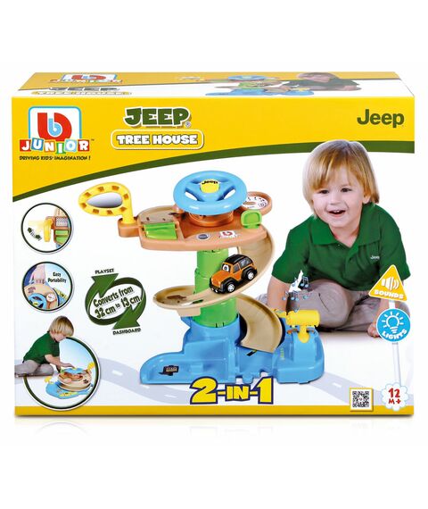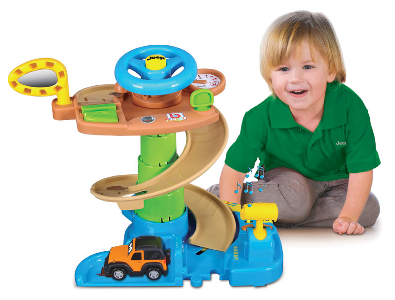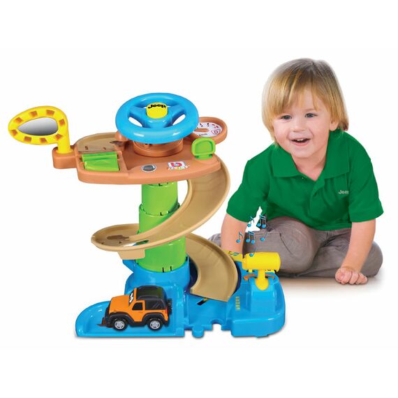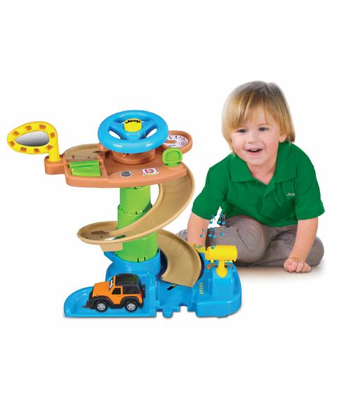 Игровой набор Скоростной спуск 2 сочетает в себе два разных состояния ("2 в 1"): в начальном положении это возможность включать освещение и звуки,имеется руль который позволяет использовать набор как манипулятор места водителя. В открытом положении спиральный пандус поднимается более чем на 17 см и служат для спуска Джипа.