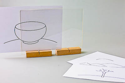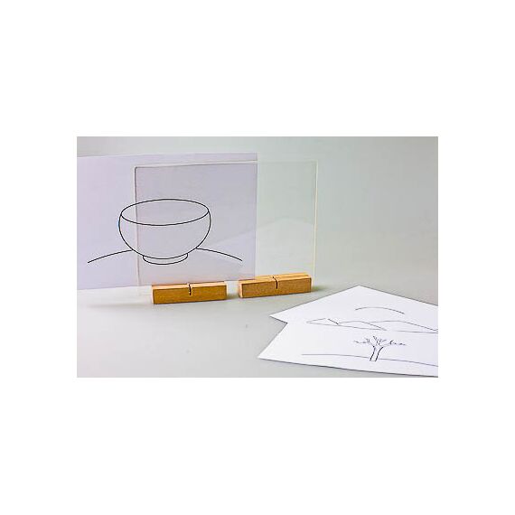 Рабочая поверхность мольберта изготовлена из акрилового стекла и вставляется в подставки из натурального бука. Подставки позволяют его использовать в вертикальном, горизонтальном положении, а также параллельно рабочей поверхности стола.