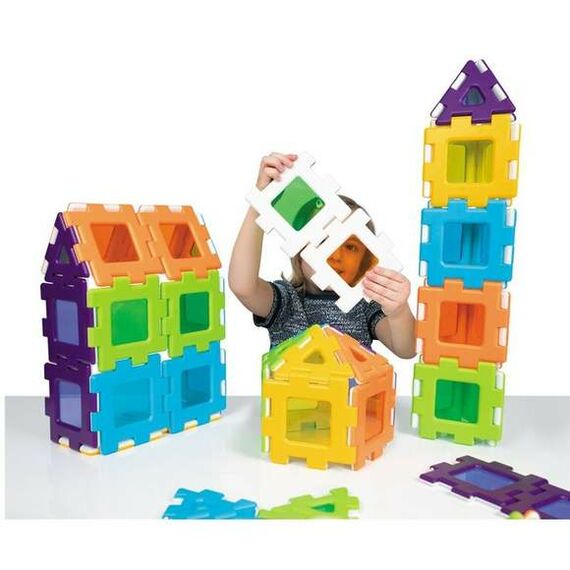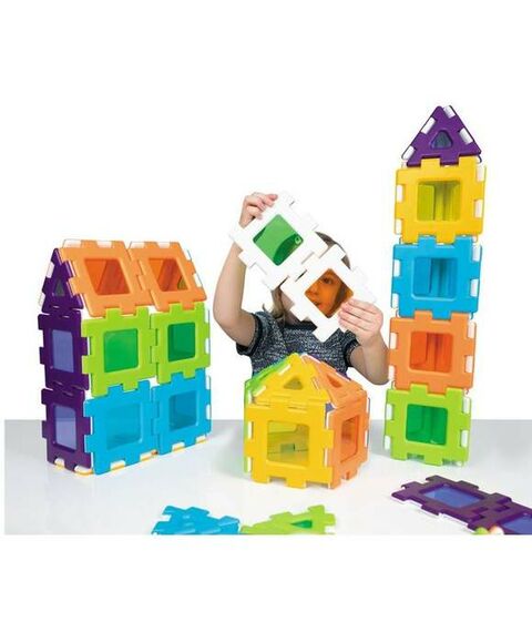 Предназначен для групповой игровой деятельности. Детали идеально подходят для того, чтобы маленьким ручкам было удобно с ними работать. При помощи этого конструктора дети в процессе игры смогут уже в раннем возрасте развить пространственное мышление, осваивая работу с двух- и трёхмерными фигурами. Включает в себя две главные геометрические фигуры — квадрат и треугольник 5 цветов (желтый, голубой, зеленый, оранжевый, фиолетовый). Цветные детали были разработаны, чтобы помочь детям исследовать смешивание цветов и строительство в увлекательной форме, выглядят эффектно на светлом столе или против источника света.