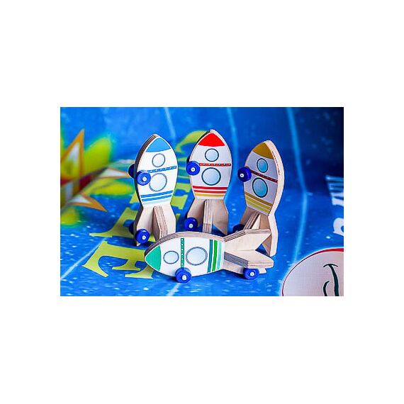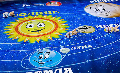 Игровой набор представляет собой напольный коврик размером 2х1,5 м, выполненный полноцветной печатью на виниловой основе. Макеты космических ракет выполнены из фанеры с последующей обработкой, наклейки для маркировки ракет выполнены на самоклеящемся материале.