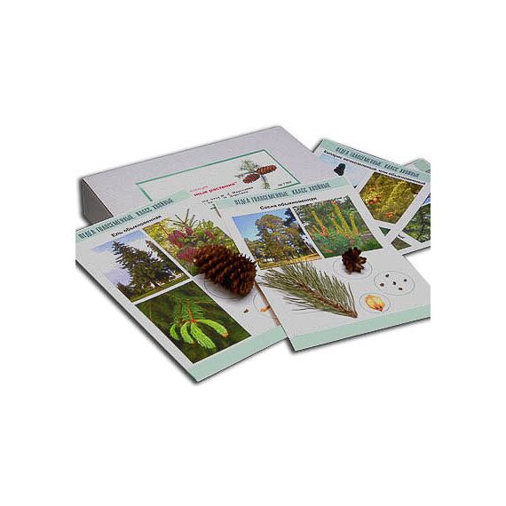 В коллекции представлены побеги, шишки и семена хвойных растений. Натуральные образцы сопровождаются фотографиями взрослых растений. Планшеты формата А4 изготовлены из картона и ламинированы глянцевой пленкой.
