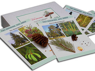 В коллекции представлены побеги, шишки и семена хвойных растений. Натуральные образцы сопровождаются фотографиями взрослых растений. Планшеты формата А4 изготовлены из картона и ламинированы глянцевой пленкой.