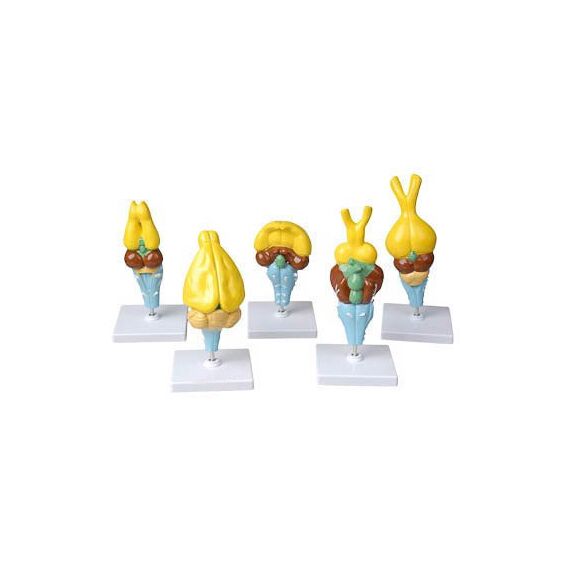 Комплект состоит из 5 моделей головного мозга позвоночных животных. Модели демонстрируют внешнее строение головного мозга позвоночных. Модели неразборные, изготовлены из гипса и снабжены пластмассовыми подставками. Для удобства на моделях отделы мозга обозначены контрастными цветами.