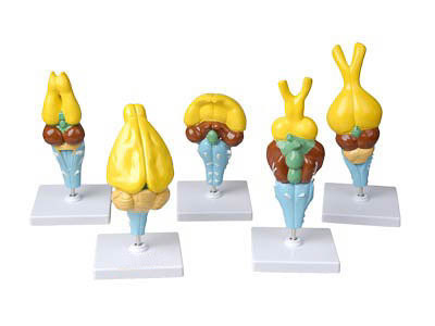 Комплект состоит из 5 моделей головного мозга позвоночных животных. Модели демонстрируют внешнее строение головного мозга позвоночных. Модели неразборные, изготовлены из гипса и снабжены пластмассовыми подставками. Для удобства на моделях отделы мозга обозначены контрастными цветами.