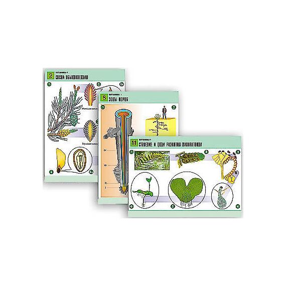 Перечнь таблиц: 1. Грибы. 2. Сосна обыкновенная. 3. Зеленые водоросли. 4. Образовательные ткани. 5. Лишайники. 6. Органы цветкового растения. 7. Бурые и красные водоросли. 8. Зоны корня. 9. Зеленые мхи. Кукушкин лен. 10. Семена. 11. Строение и цикл развития папоротника. 12. Клетка зеленого листа.