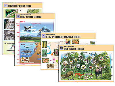 Перечень таблиц: 1. Центры происхождения культурных растений. 2. Центры происхождения домашних животных. 3. Защитные окраски и формы тела у животных. 4. Формы естественного отбора. 5. Критерии вида. 6. Пути биологического прогресса. 7. Направления эволюционного процесса. 8. Палеонтологические доказательства эволюции. 9. Сравнительно-анатомические доказательства эволюции. 10. Зародышевое сходство позвоночных животных. 11. Этапы эволюции человека. 12. Схема строения биосферы. 13. Связи в лесном биоценозе. 14. Трофические связи и уровни в степном биоценозе.