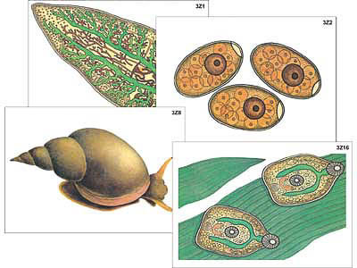 Описание Модель-аппликация "Циклы развития печеночного сосальщика и бычьего цепня" (ламинированная)