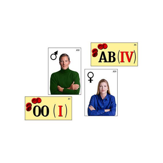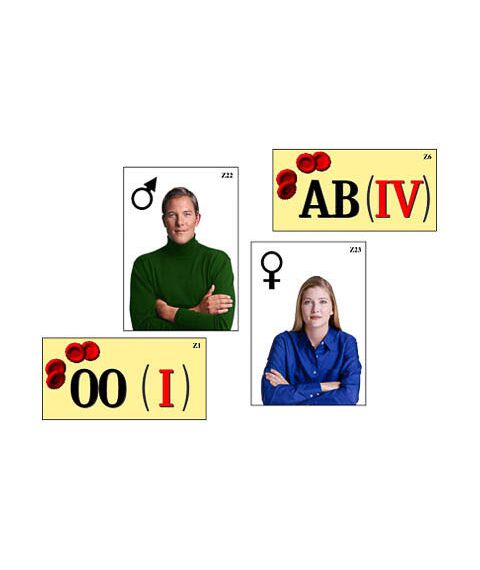 Пособие включает в себя ламинированные карточки с магнитными креплениями с условными обозначениями групп крови и прочими знаками. Карточки ламинированы матовой (антибликовой) пленкой и снабжены магнитами, что позволяет легко крепить их на магнитной доске или экране для динамических пособий.