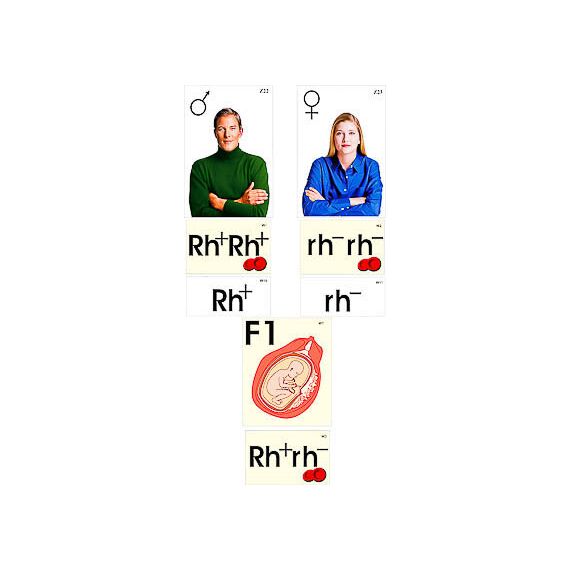 Пособие включает 16 цветных ламинированных карточек с магнитными креплениями, из которых на магнитной доске монтируется схема наследования резус-фактора.