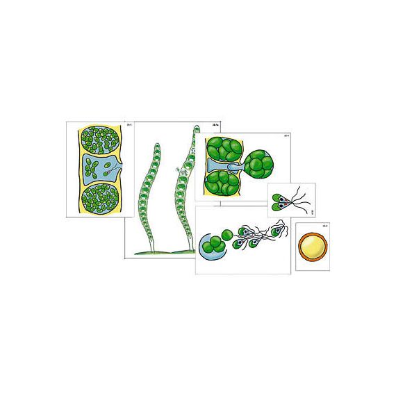 Пособие включает 11 карточек, иллюстрирующих этапы бесполого и полового размножения многоклеточной водоросли (на примере улотрикса). Карточки ламинированы матовой (антибликовой) пленкой и снабжены магнитными креплениями, что позволяет монтировать схемы на магнитной доске или экране для динамических пособий.