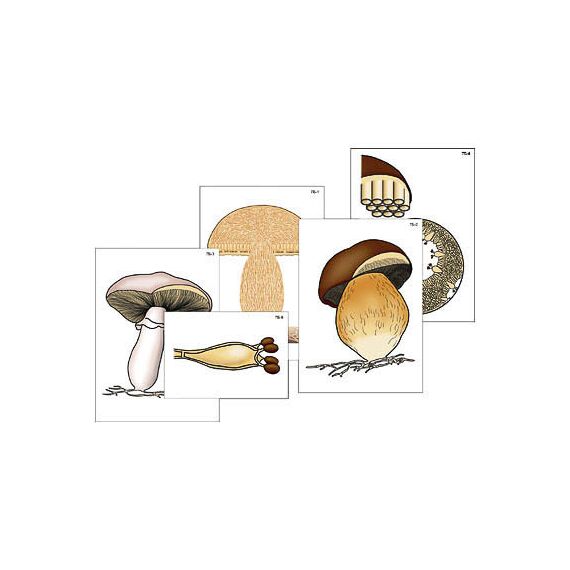 Пособие включает 8 карточек, иллюстрирующих особенности строения и размножения трубчатых и пластинчатых шляпочных грибов. Карточки ламинированы матовой (антибликовой) пленкой и снабжены магнитными креплениями, что позволяет монтировать схемы на магнитной доске или экране для динамических пособий.